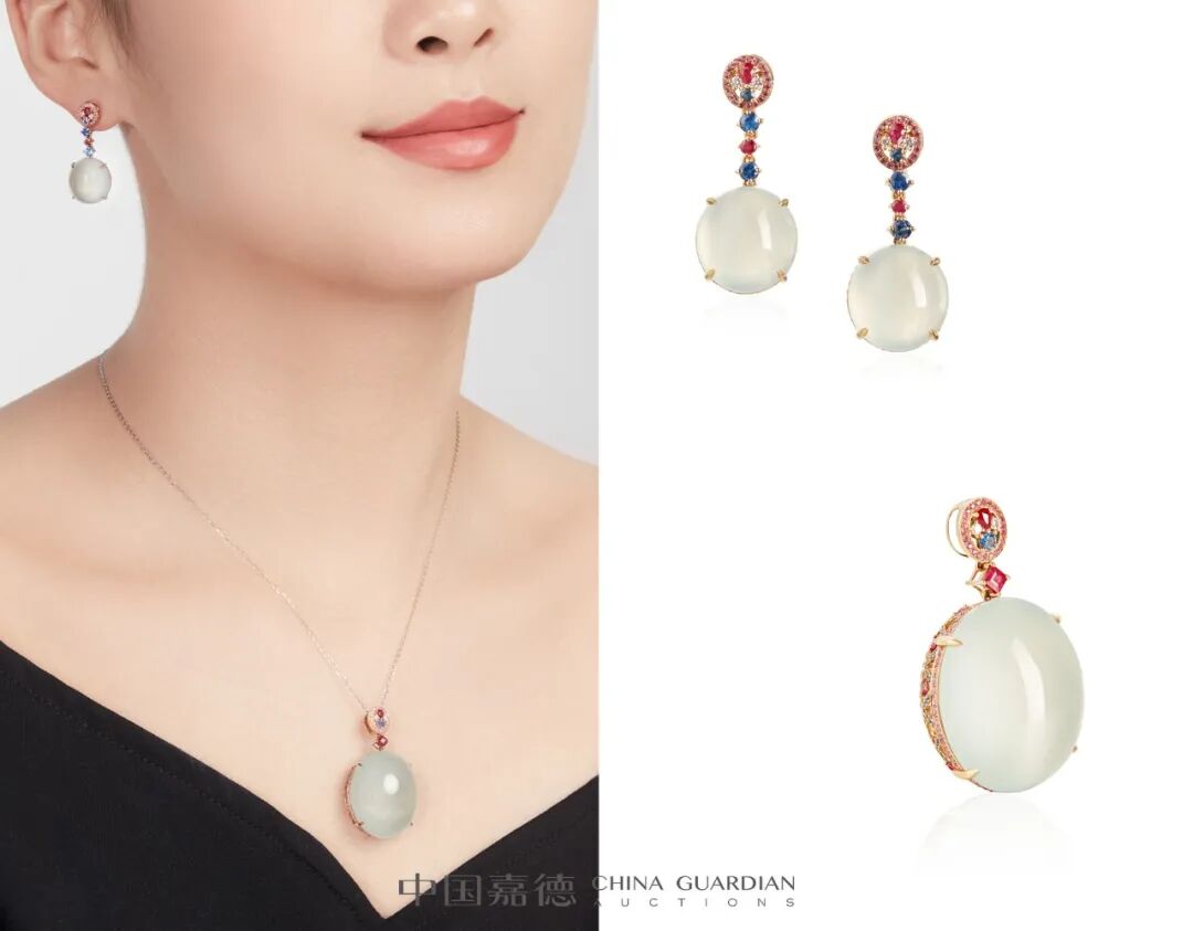 天然冰种翡翠配彩色宝石及钻石吊坠,耳环套装