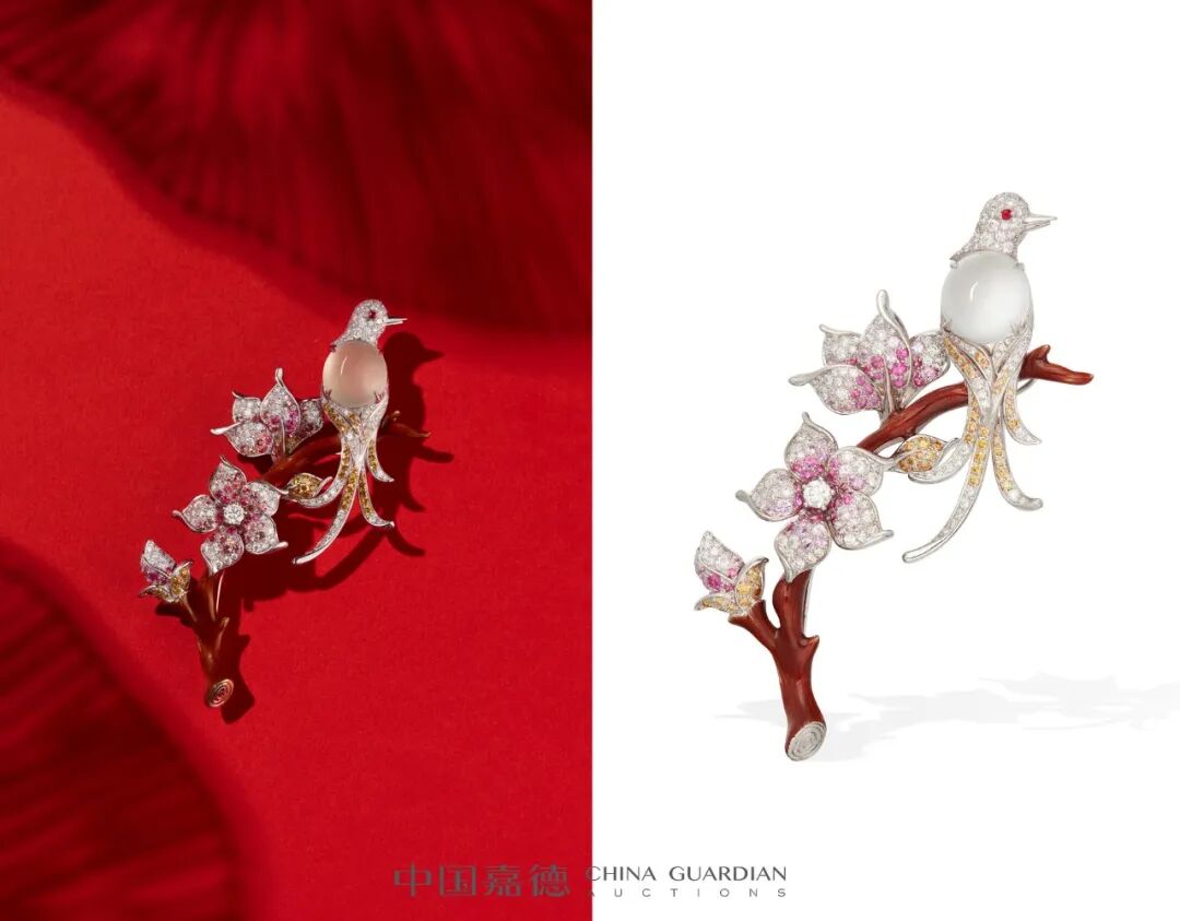 18K金镶嵌天然翡翠、低温珐琅、彩色蓝宝石、月光石及钻石,项链长度约465mm(可调节),胸针尺寸约62 × 40mm