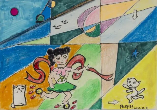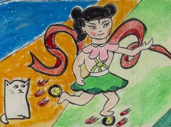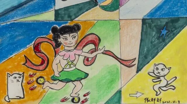 如今,作为哪吒原型的张郎郎拿起画笔绘下了这个脚踏风火轮的小英雄。不同于《哪吒闹海》中的形象,张郎郎是将哪吒形象和父亲的另外一条创作路径——“毕加索加城隍庙”相结合。
