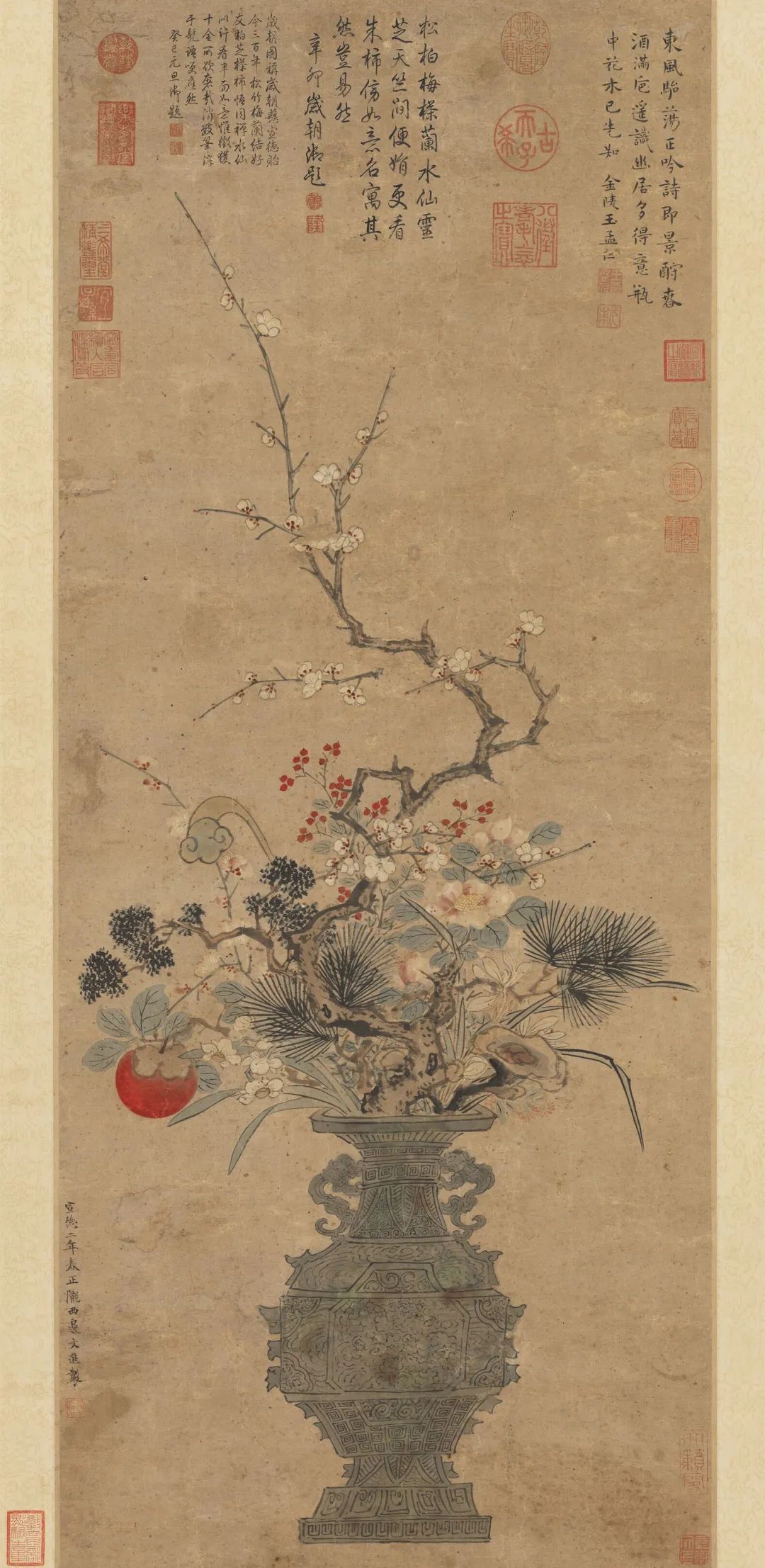画面上古朴的铜壶内插梅、兰、山茶、水仙、天竺、灵芝、松、柏、柿子、如意等十种花材,象征十全。红色也是很醒目的存在哦~