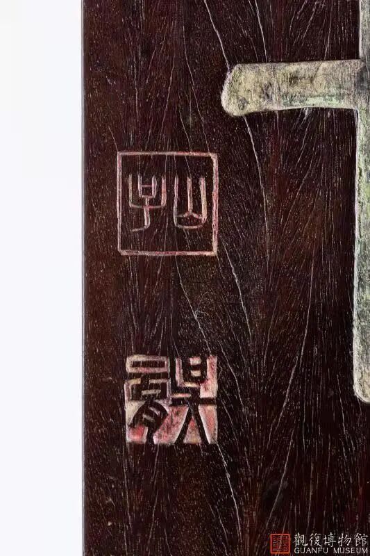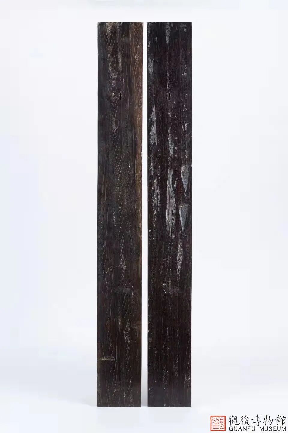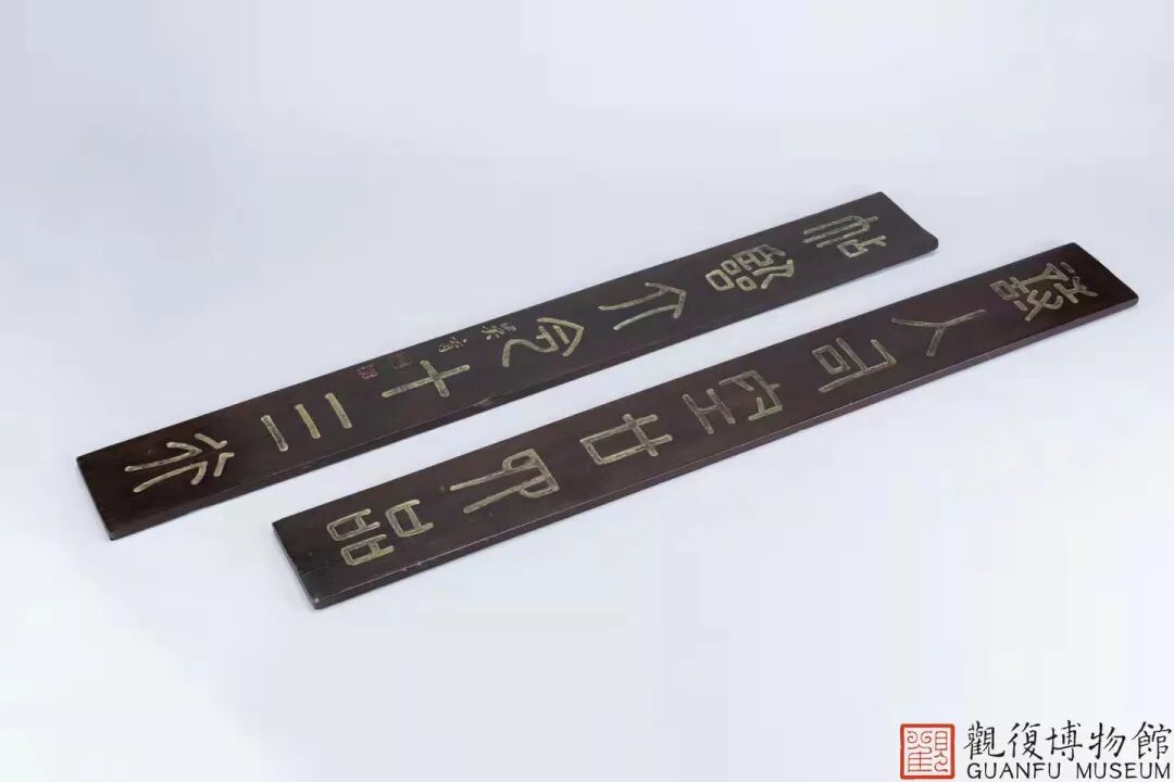 春节写的叫“春联”,平时写的叫“对联”。观复博物馆收藏了一对写有对联的镇尺,以乌木为材,深凿14个篆体字,文字方正而又合法度。尾落“吴育”,下配阴文“山子”篆书印,和阳文“吴育”。