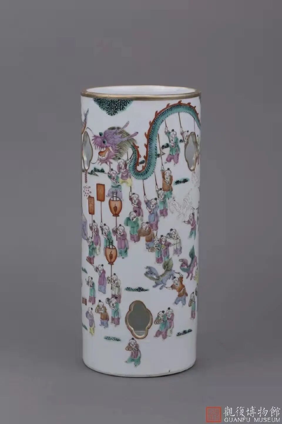 清同治 粉彩百子龙灯图海棠形开光帽筒