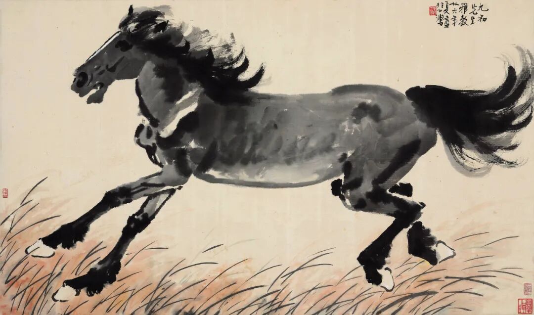 徐悲鸿的“马”不是传统绘画中的形态,他笔下的马有了透视,又有造型的光影、结构和解剖,但这些造型因素又巧妙地修正、转化为笔墨。徐悲鸿将偏、中锋兼用,并通过虚实、粗细、浓淡、枯润、轻重等变化而消解了单纯的轮廓线,使外轮廓与内体面融为一体,既描述形又表现了体面,既有笔又有墨。体现了徐悲鸿革新中国画思想内核的合理性,因为他的笔墨建立在造型上而又超越了造型。