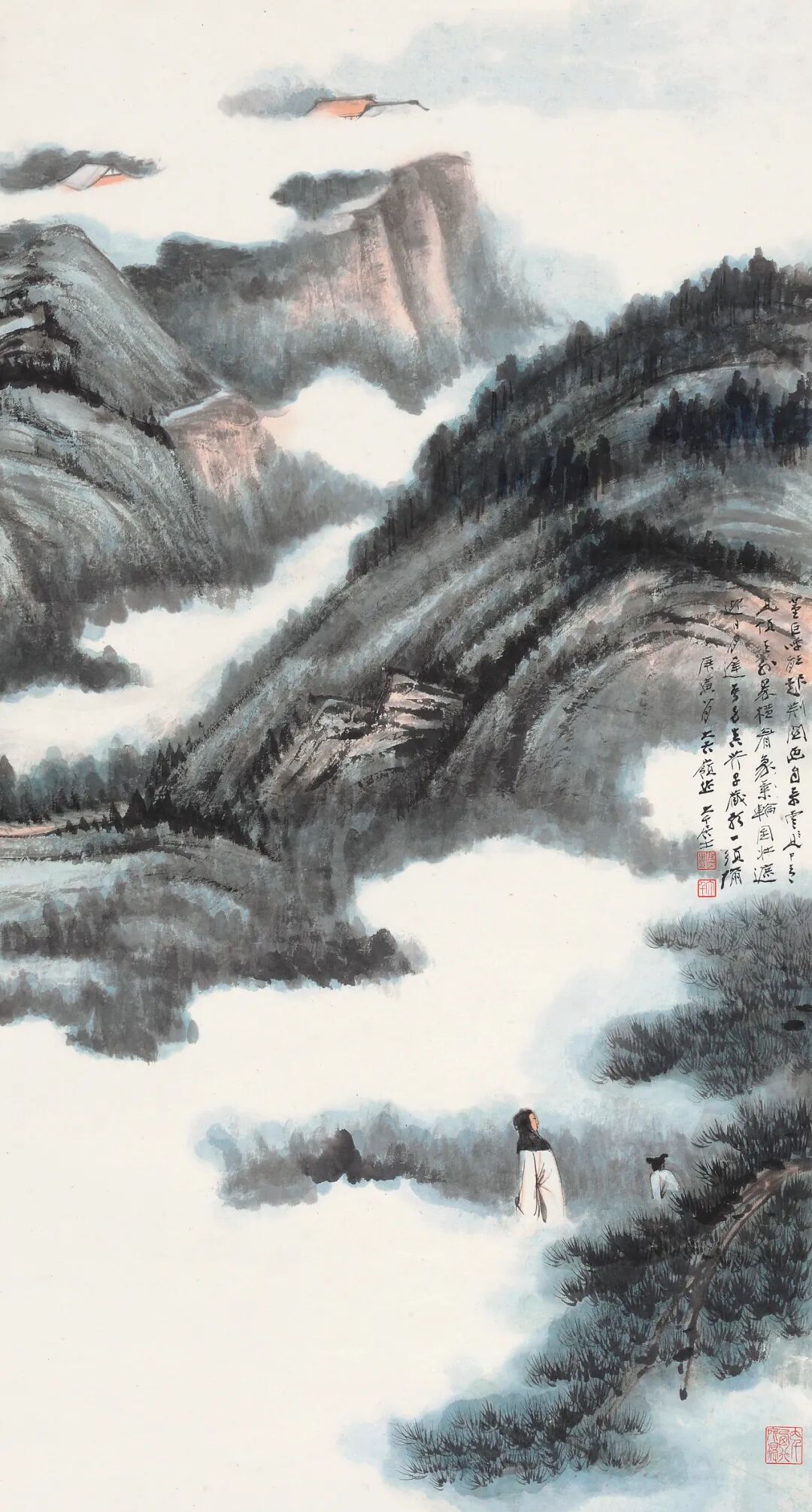 【题识】董巨呼能起,荆关画自来。云中青见顶,天外翠横眉。气象轮囷壮,遮迎日月迟。吾身真芥子,藏影一须弥。庚寅八月大吉岭作,大千居士。