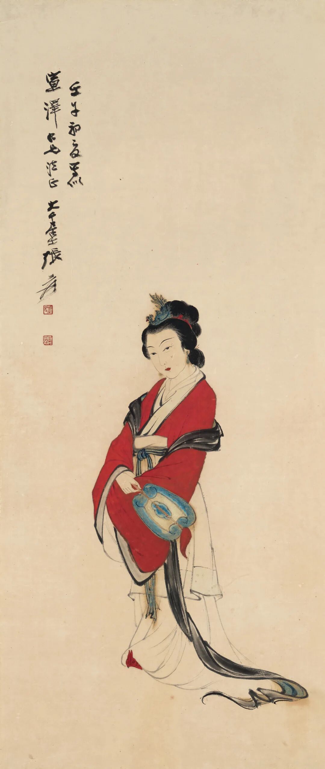 张大千的人物尤以仕女最为画道人赞赏,此幅《执扇仕女图》作于1942年初夏,是大千先生受敦煌壁画影响的代表性作品。此幅写执扇仕女,精致富丽,体态曲线,源自敦煌佛像的站姿,运笔线条全法盛唐菩萨像的富丽堂皇,仕女浓丽丰满、雍容华贵。