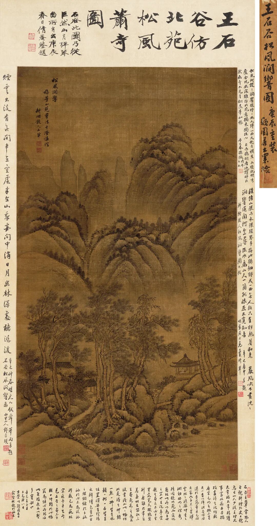 估价:RMB 3,200,000-3,800,000孙儆(1866-1952),字敬人、谨丞、谨臣,号沧叟,室名沧园、经畬楼、斐庐,江苏南通人。举人。曾官四川,后供职国史馆,并在乡创建孙氏私立小学。晚岁经营实业,致力垦植。工书法,藏书数万卷。高燮(1879-1958),字时若、吹万,号寒隐、葩叟等,室名吹万楼、袖海棠等,江苏金山人。南社耆宿。藏书极富。工书法,多种著述出版。缪谷瑛(1875-1955),字莆孙,号由里山人,江苏江阴人,寄居上海。为黄山寿再传弟子,曾任中学教师、大学教授。工花卉、尤以画菊名世,海上名家之一。俞吟秋(民国),号颖园居士,南通金石书画会创立,任会长。董其昌有缩本山水,皆摹家藏宋元名作中一幅自题“赵文敏学董北苑天下第一”,即世传《万壑松风》也。石谷此帧即转仿此图。图中峰峦苍厚,乔松秀挺,士人游居于竹屋茅亭之间。山石晕染周至,似是其六十左右所作。裱边有吴湖帆、高吹万、缪谷瑛等诗题,可见流传有绪。![]()