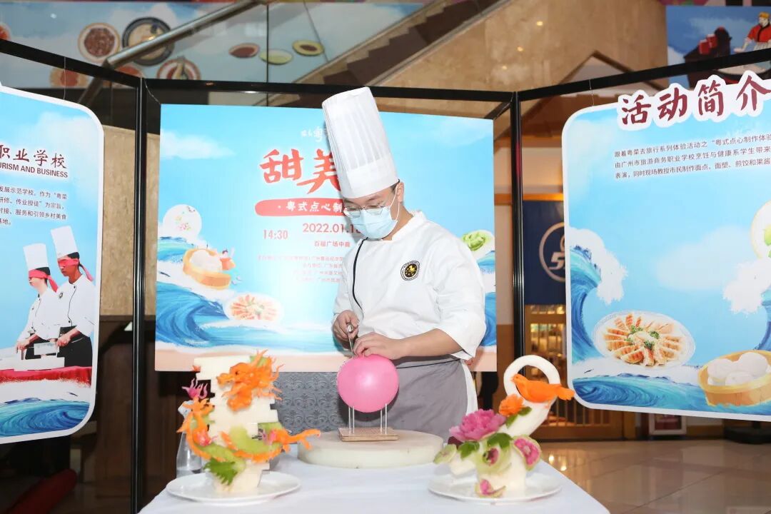 为了让更多的观众更了解粤菜、挖掘粤菜传承的历史文化,1月18日下午,我们推出了“跟着粤菜去旅行”系列体验活动的第一场“甜美点——粤式点心制作体验”。由广州市旅游商务职业学校烹饪与健康系学生带来刀功表演,同时现场教授市民制作面点、面塑、煎饺和果酱画,带领市民体验粤式点心的制作过程。