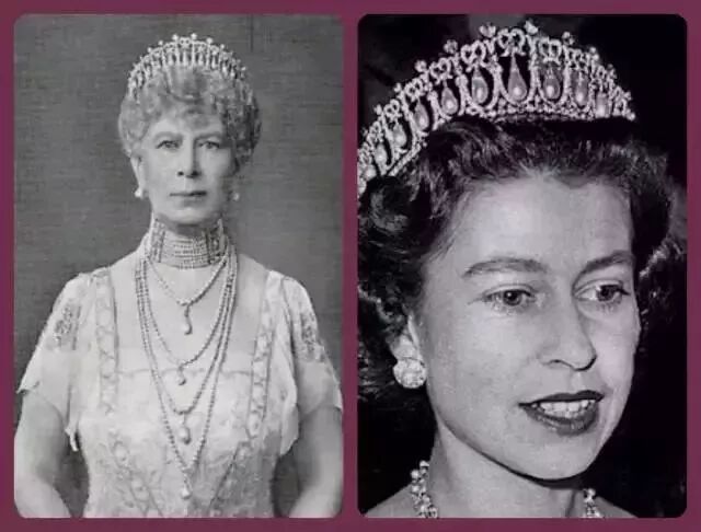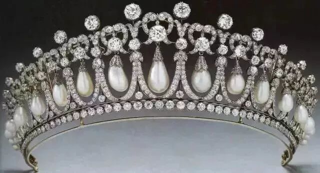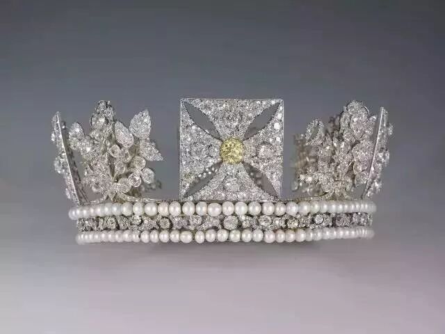 这顶皇冠也是可以被载入历史史册的一个。玛丽的祖母剑桥公爵夫人从自己的母亲处得到了这顶珍珠泪,作为她的结婚礼物。