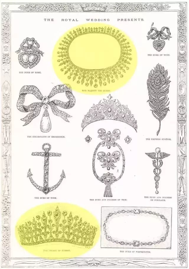 当年玛丽皇后获赠的部分结婚珠宝的设计草图