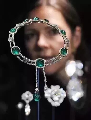 造型和那条短项链一样。由8颗大的圆形祖母绿组成主链身,周围镶满钻石。