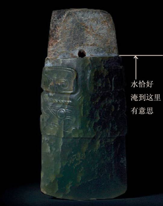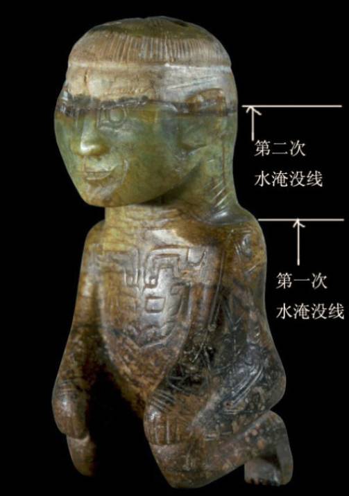 水沁和土沁一样是造成各种沁色的原因。水沁有两种情形,一种是局部水沁,一个是全部被水淹没,即整体受沁。水沁造成的玉面变化比土沁要小。因为如果是满水淹没,反而造成了玉器与空气的隔绝,和与其他物质的隔离,而水中存在的各种化学物质、有机物质浓度相对比较低,所以对玉器造成的侵蚀也出现不同的情形。从实物观察来看,有些水沁仅在局部留下痕迹,且比较淡。而凡是没有完全淹没的玉器,可以看到其受沁部位应该有一条等高线。水沁还会在玉器的裂隙形成绺璺沁。