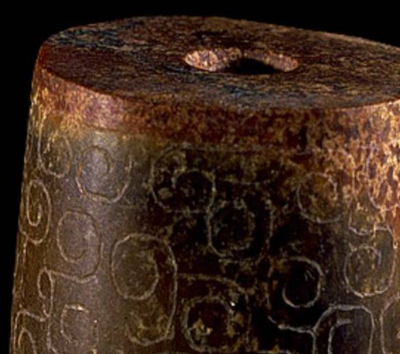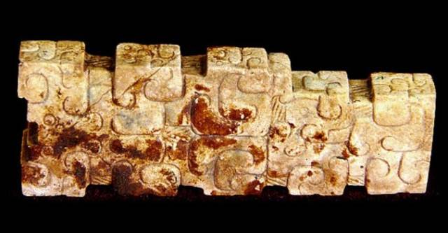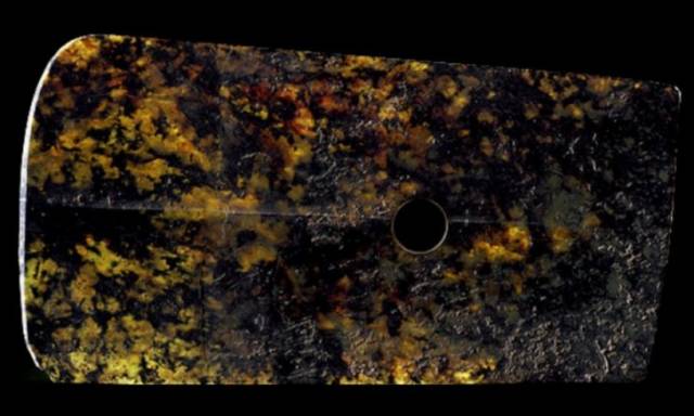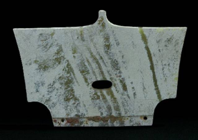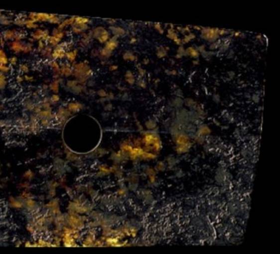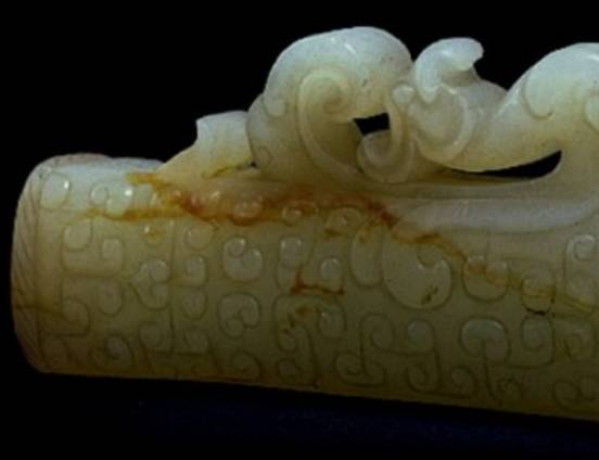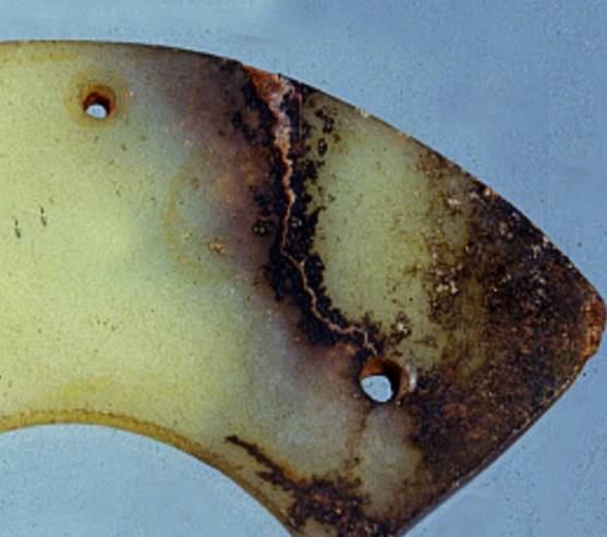 受沁的程度有重有轻,重的地方还带有棕红或黑红的块状物。沁成这种程度需要千年以上的时间。