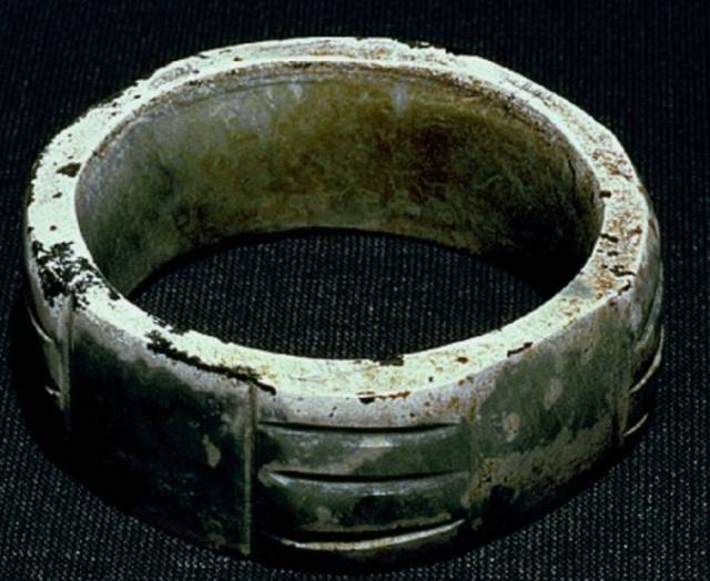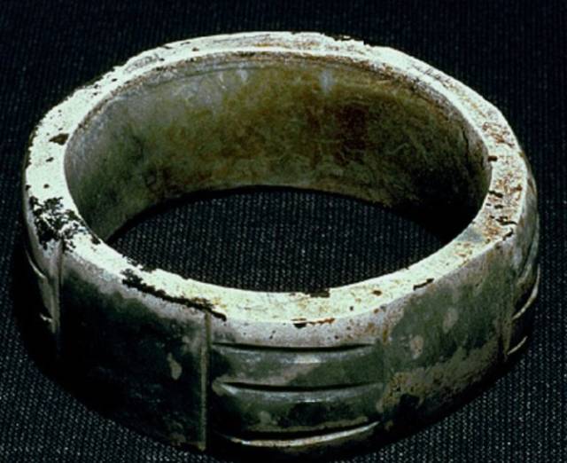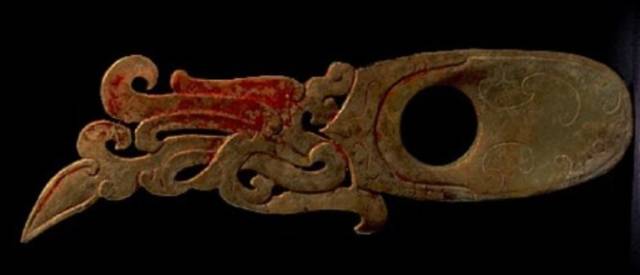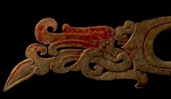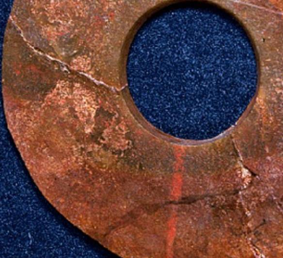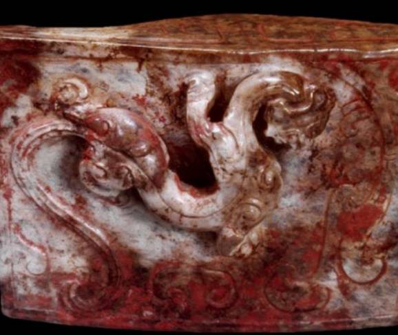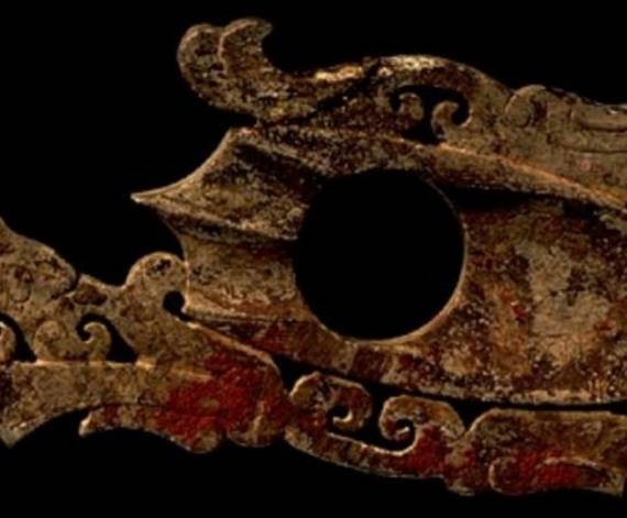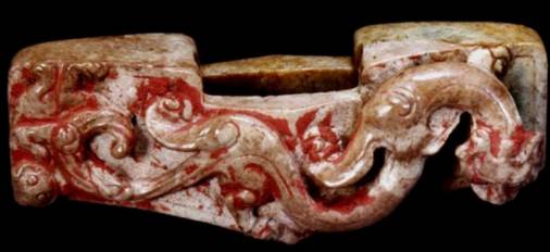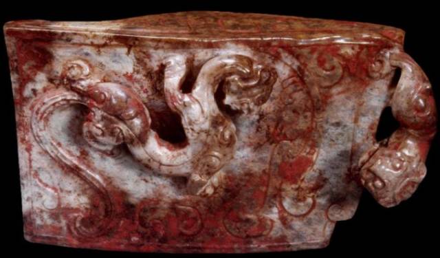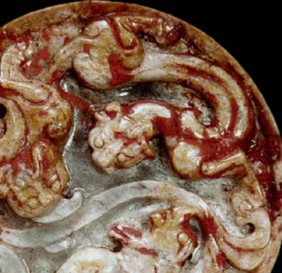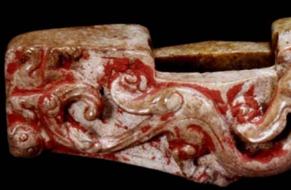 在出土的古玉中人们发现有些红色的沁色,人们将其原因分为四种,一是受朱砂侵染,二是血水浸染,三是纺织品的颜料染色,四是铁沁。现在分别来看,先看朱砂沁。