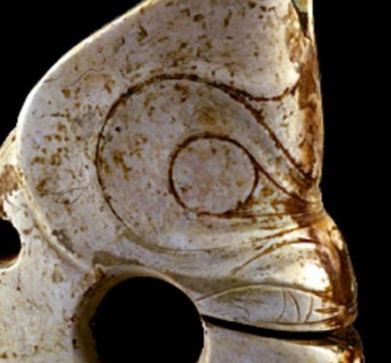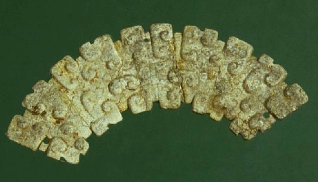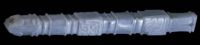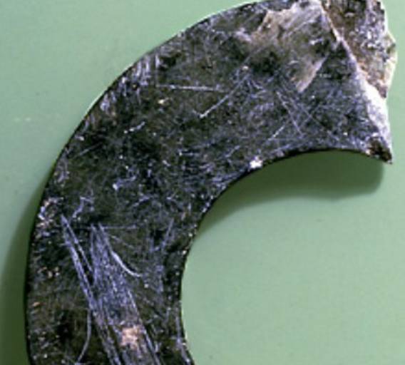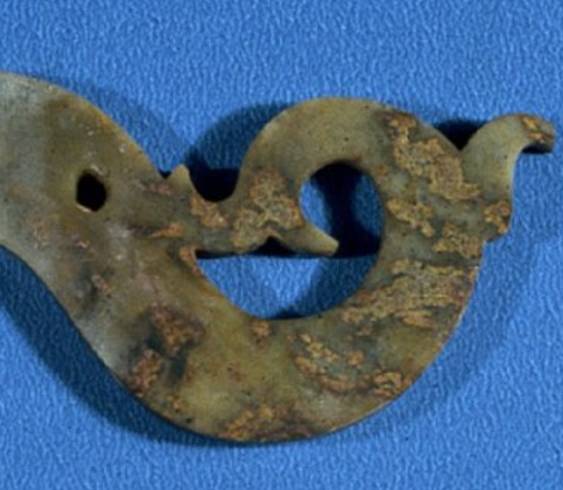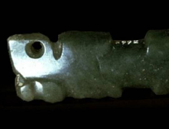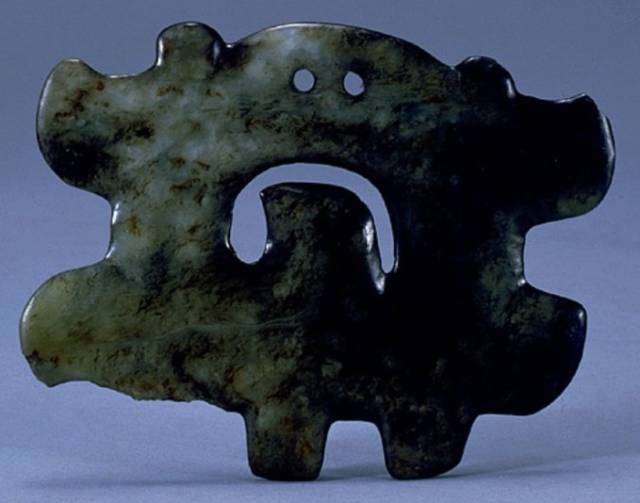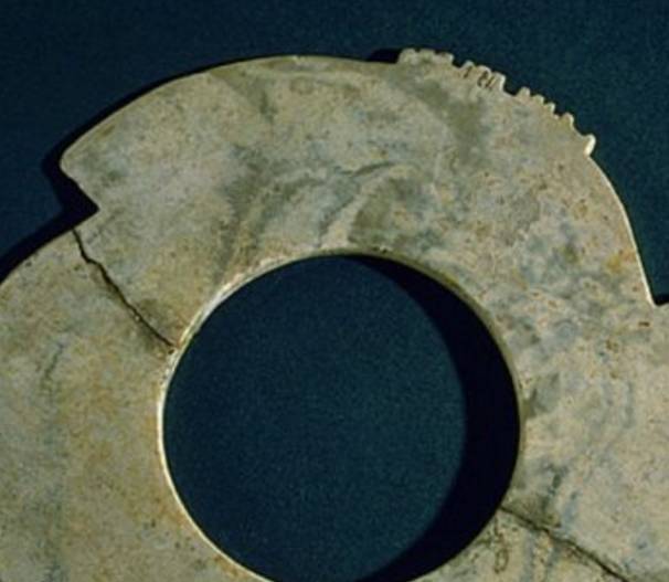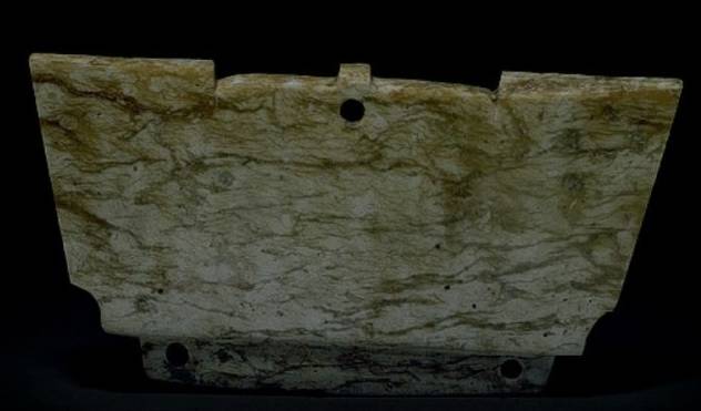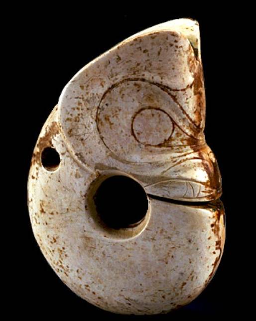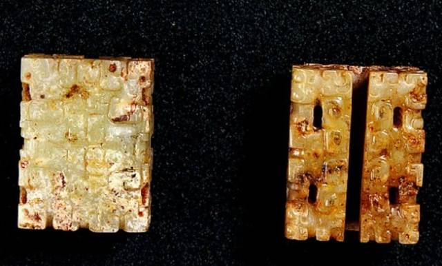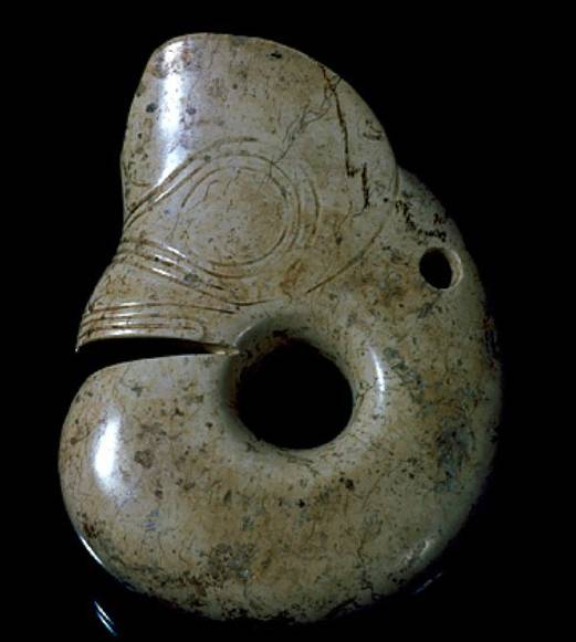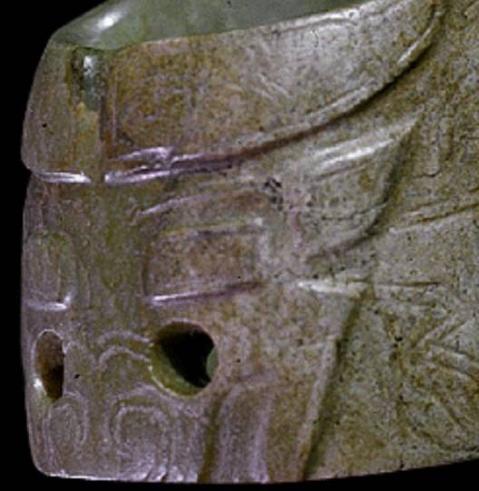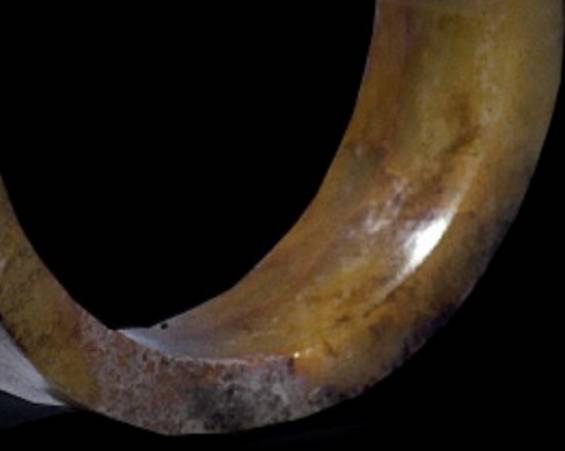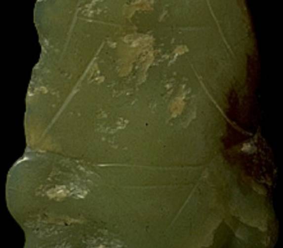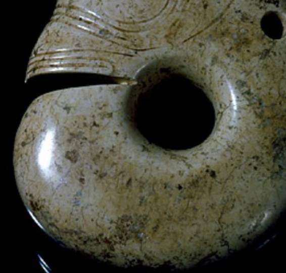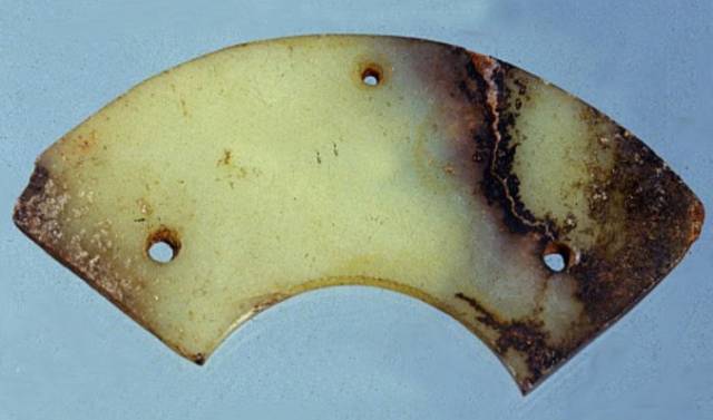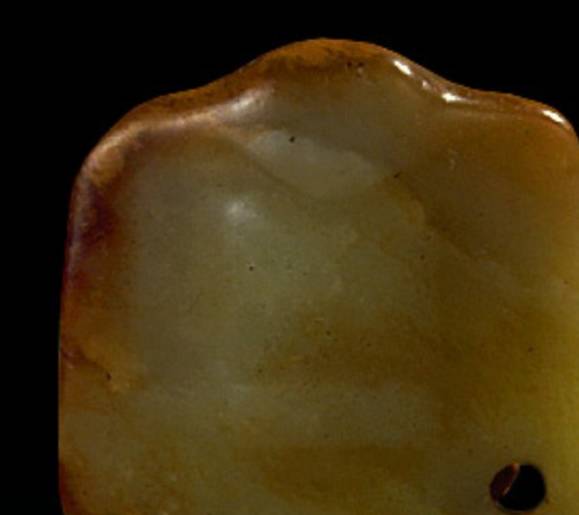 以上这几块玉制作时间在4000年至6000年前。这种玉器在刚出土的时候非常脆松。曾经有过刚出土的玉放入水中清洗时立即化掉,因此此种玉器如果有断面的话,你可以看到内部已经钙化。但如果恢复得好经擦拭有时也会出现光泽,见第二张图片。