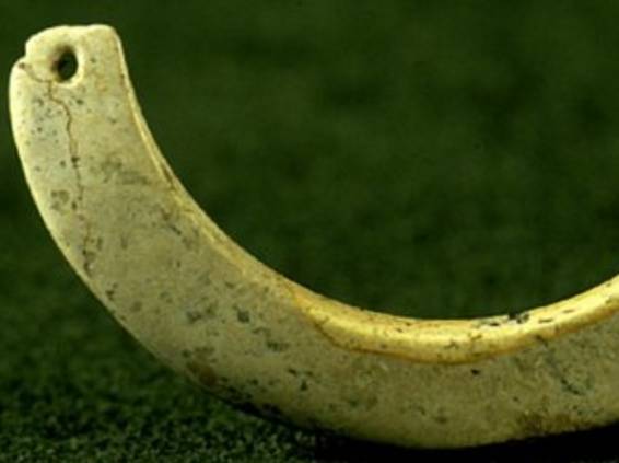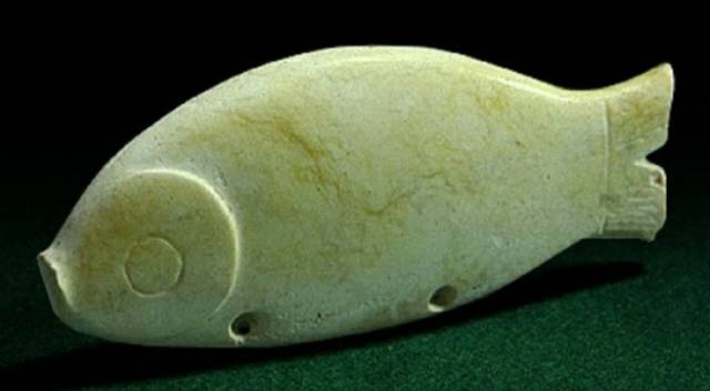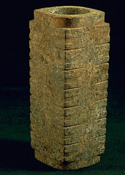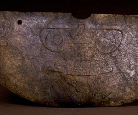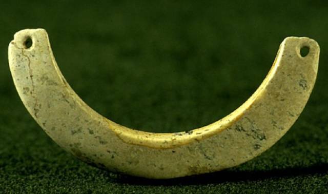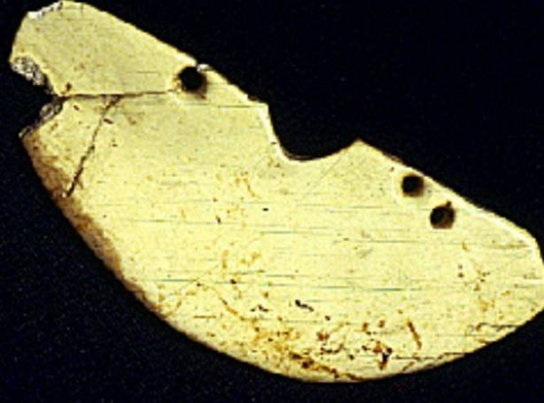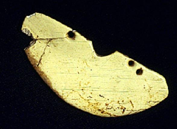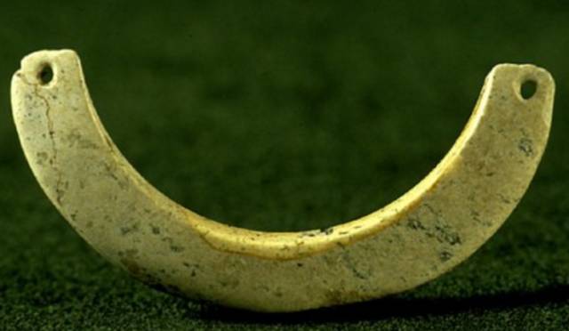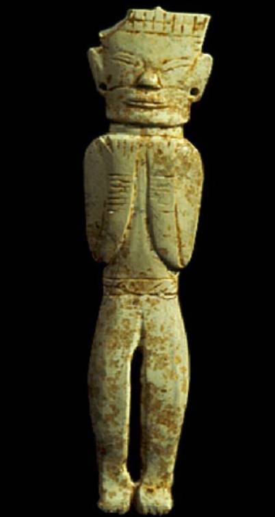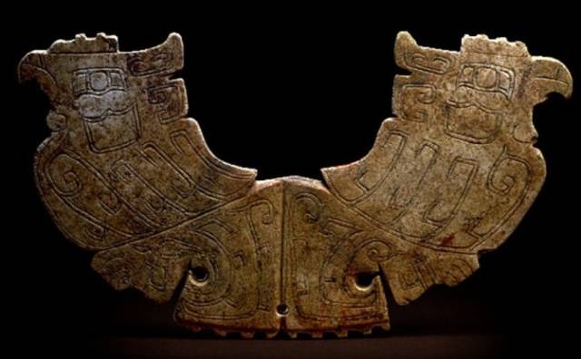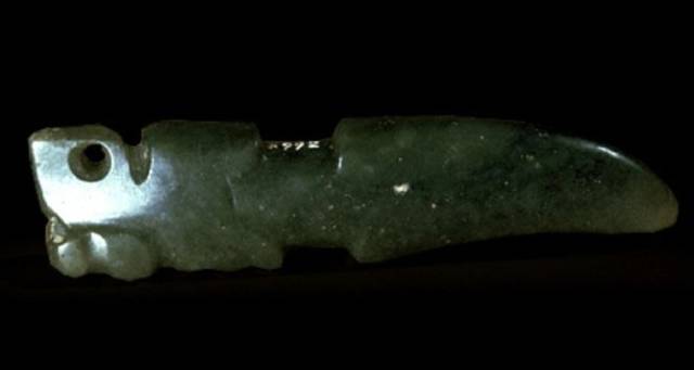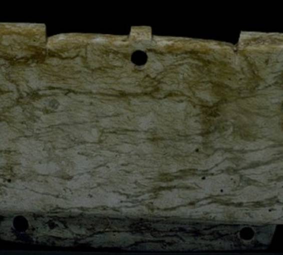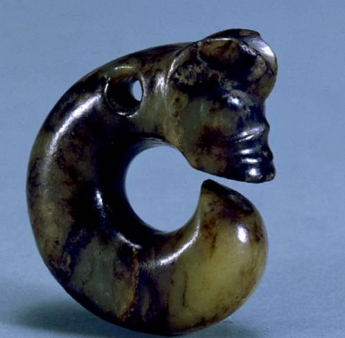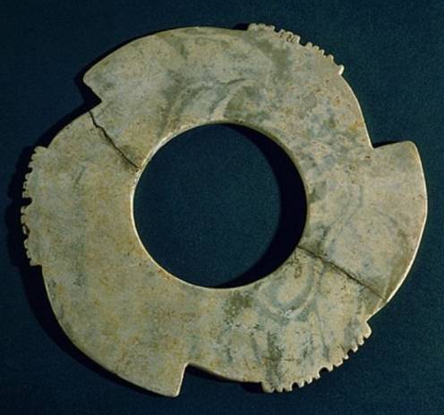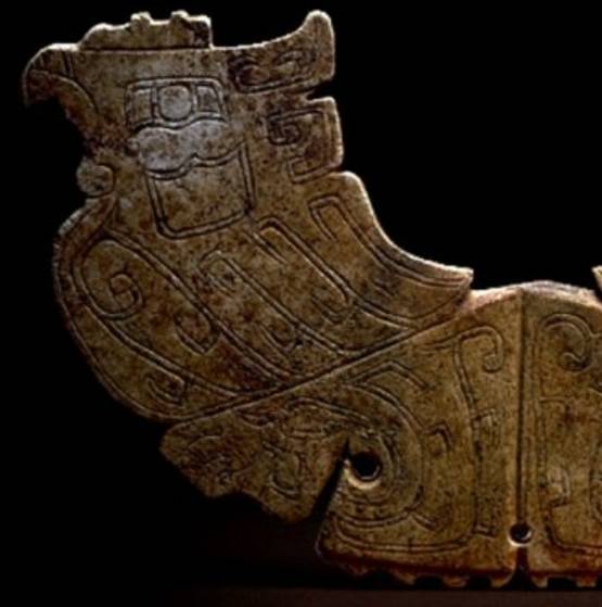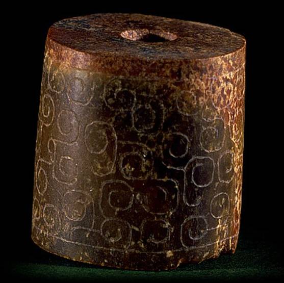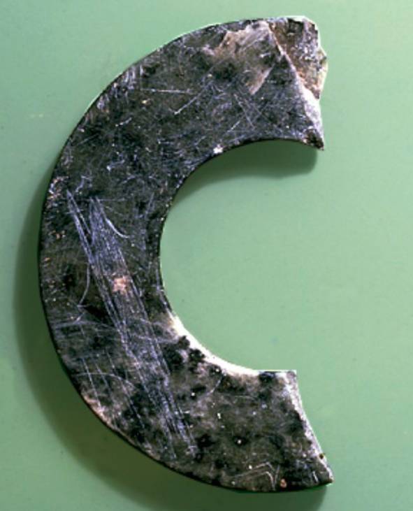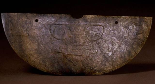以上这几块玉制作时间在4000年至6000年前。这种玉器在刚出土的时候非常脆松。曾经有过刚出土的玉放入水中清洗时立即化掉,因此此种玉器如果有断面的话,你可以看到内部已经钙化。但如果恢复得好经擦拭有时也会出现光泽,见第二张图片。