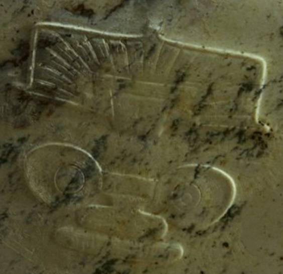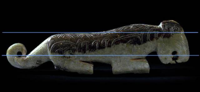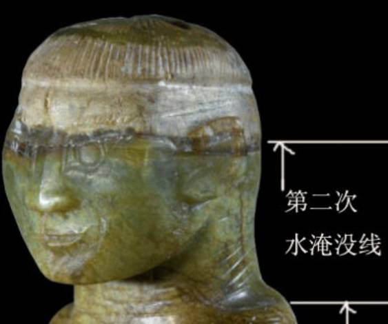 下面这块玉先形成了一条水沁线,以后尾部下沉,所以尾部和头部等高线发生变化。