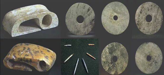 图⑾的三件玉牙璧,虽然均出土于大连四平山,但是东西却在日本。上世纪初日本人占领辽东半岛,挖地三尺,只为寻找大和民族在中国的根,这样就可以为它吞并中国找到借口。1978年,中国考古工作者在大连市长海县吴家村遗址采集到一只岫岩玉做的牙璧,见上图之⑷,欣喜若狂,因为凡是能挖走的,当年日本人都挖走了,想不到还有劫后之余。而直到长达六十七年以后,日本人才公布了当年在四平山遗址的考古报告,于是图⑾的三件牙璧,才得以重见天日。