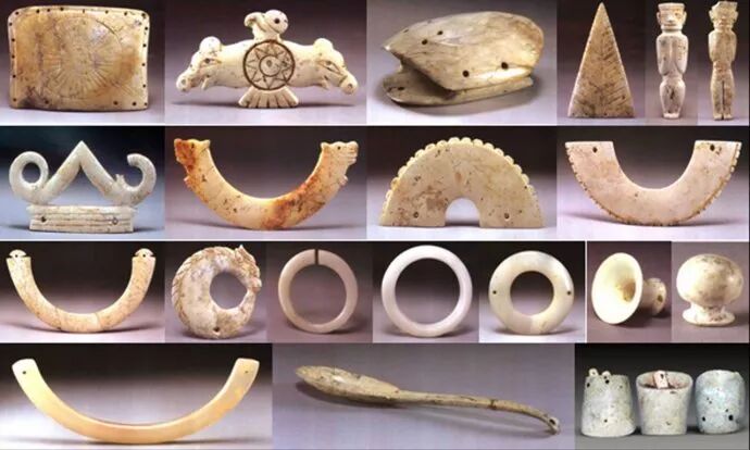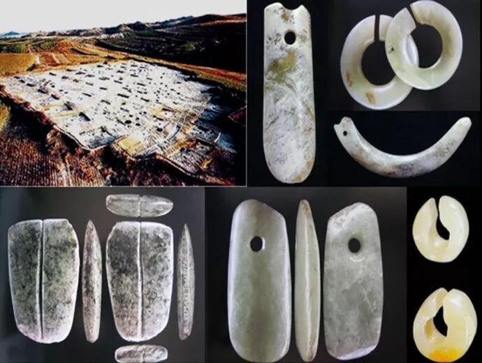 4、兴隆洼遗址全貌和这里出土的玉器。最初的人类,普遍使用骨制和牙制装饰物,可能他们在打制石器的过程中,或者是在西辽河河滩上的卵石堆上,发现了这坚硬而美丽的石头,用它来做装饰品,具有特殊的光泽和高贵的质感。但是,用玉石来作装饰物,在当时的条件下,需要花费巨大的人工成本,所以,只有发达的农业和长期定居的环境,才能为这样的消费,提供物质上的保证。