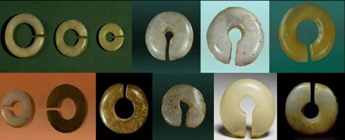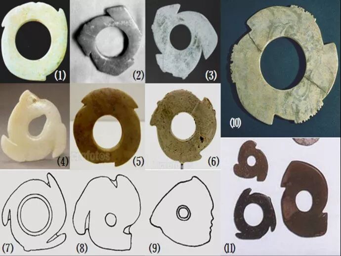 59、神秘的玉牙璧(璇玑)是海隅文明的代表玉器之一。玉牙璧和玉牙璋、玉圭等礼器一样,也是山东龙山文化玉器的代表作品,它们都起源于山东半岛,最后又都风行于夏、商、周三代。图⑴出土于山东省海阳市司马台遗址,现藏于海阳市博物馆,直径14.4㎝,孔径11.4㎝,厚1.05㎝。图⑵出土于山东临朐市西朱封村遗址,外径10.8㎝,内径6㎝。图⑶出土于山东日照市五莲县丹土遗址,外径22.5㎝,内径17.2㎝。图⑷出土于大连市长海县吴家村遗址,直径6.5㎝,厚0.5厘米。图⑸⑹⑻⑼均出土于山东胶州市三里河遗址。图⑺和图⑾均出土于大连市甘井子区四平山遗址。图⑽出土于山东滕州市里庄遗址。牙璧的这种特殊形状,与牙璋一样不可思议,它曾被看作是古代的天文仪器,或者是织机上的零件,这是人们认识事物的一个必须的过程。但是当我们分析夏民族或者“海隅族”的起源,就不难看出这几样东西的原始用途。笔者之所以称山东龙山文化玉器为“海隅文化玉器”,而夏民族起源于山东之海隅,是因为包括长条形玉刀、玉牙璋和玉牙璧在内的玉器,它们最早都是从渔民所用常用之工具中进化出来的。