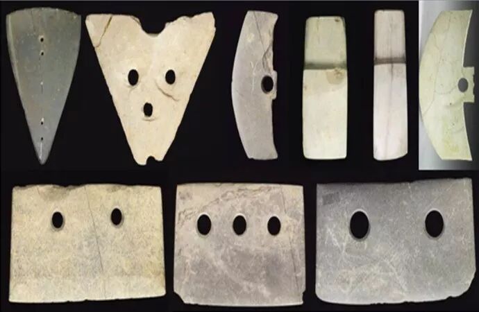 长条形弧刃或者是直刃的玉刀,是剖鱼工具,用它剖鱼或者去鱼鳞都很方便。牙璋的锋刃在其端头的弧线上,这是原始的剖蚌刀的造型,它端头的弧刃可以用来切断蚌类的闭壳肌,从而打开紧闭的蚌壳。从上图⑺和⑻中,我们不难看出所谓的玉牙璧其实是一只三刃刀片,这是渔民们在织鱼网或者修补渔网时用来割断网绳的工具,此物有两到四个钩形的刃,不为其它,只是为了轮番使用,以增加刀片的使用数命。夏代的玉礼器很多,但是唯有玉刀、玉牙璋和玉牙璧始终保留着渔民的文化特色,也就是山东海隅民族的特色。
