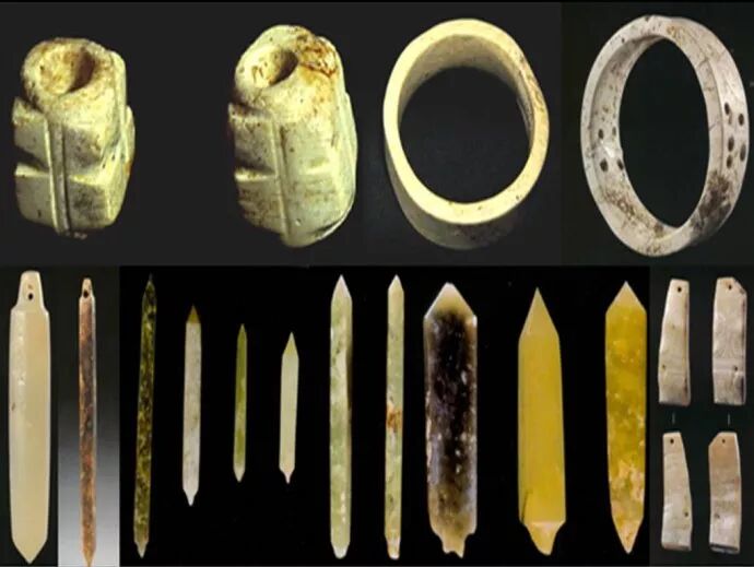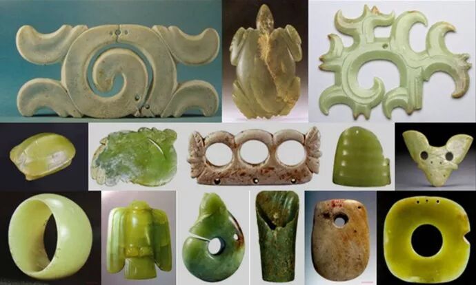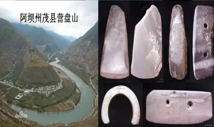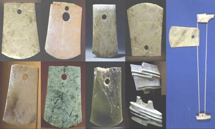 21、营盘山遗址,位于四川省阿坝州茂县凤仪镇南2.5公里,其存续时间为距今5500~6000年,这是一处新石器时代到明清时代的文化遗址,是迄今岷江上游地区发现的地方文化类型遗址中面积最大、考古工作规模最大、发现遗存最为丰富的遗址,对探讨古蜀文化与马家窑文化和仰韶文化的关系具有重要的科学价值。我们从上图中可以看出,营盘山遗址出土的古玉,仍然不能摆脱以玉石作为斧和凿的西部特色,而钻孔玉刀和玉环的出现,却说明了长江上游地区玉器的制作,正在朝着精细化和装饰性方向的发展,所以这些玉器,似乎不能看作是东北玉器文化的南传,而它本来就有着一定的基础。
