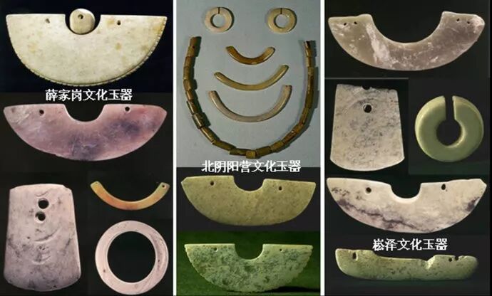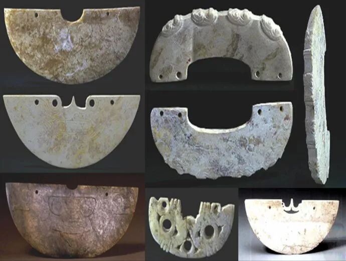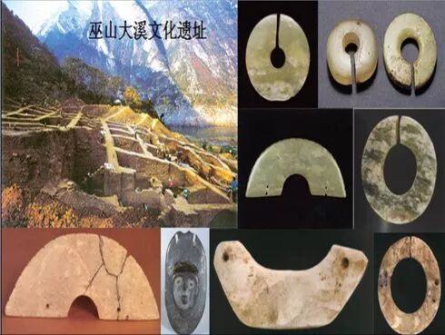 11、大溪文化,是中国长江中游地区的新石器时代文化。因四川省巫山县大溪遗址而得名。其分布东起鄂中南,西至川东,南抵洞庭湖北岸,北达汉水中游沿岸,主要集中在长江中游西段的两岸地区。大溪文化存续的年代,大约在距今6400~5300之间。在6000年前,巫山大溪是玉玦由东向西溯长江传播得最远的地方,那里是长江流出四川盆地的出口。而玉璜文化在南方长江中下游地区的兴起,不唯与水稻的种植有关,而且与渔业和原始的航运有关,我们看到这个时期的玉璜,既象船也象彩虹,它起源于南方先民们对水神的崇拜。
