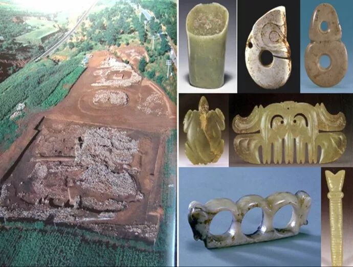10、城头山遗址,位于湘北澧县车溪乡的南岳村,这是一处新石器时代晚期城址,年代为距今4800~6000年,它的早期,属于大溪文化。在这里出土的玉玦,已经体现出南方玉器的特色,而象玉璜这样的南方玉器,也已经开始流行。这个遗址号称中国第一城,同时这里也是南方文明向北方扩张的第一个中转站,从这里越过长江,可以进入江汉平原,再向北,可以从大别山西侧进入淮河平原,再向北,则可进入黄淮平原。在距今6400年左右,南方文明向东方和北方的扩张是极为惊人的,速度极快。很显然,南方民族不再满足于江南丘陵地带的自然环境,他们在长江中下游平原、江汉平原、苏皖平原和华北平原的南部,发现了大片大片可以种植水稻的优良土地,以及非常丰富的水资源和野生动物资源。如果从中国地形图上看,中国的中东部是一大片的代表低海拨的绿色,而长江中下游平原,是中国最年轻的大陆,苍海桑田,她们刚刚不久从浅海、湖沼转变为适于耕种的土地。当然,从浅海的海床变成平原也许要经过了几千年或几万年的时间。这也就是为什么,中国几万、几十万年以上的最古老的人类遗址,均出现在高原地区和平原中偶见的山区,而低海拨的近海平原,则很少见到古人类活动的遗迹。