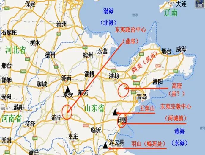 我们假定东海之神禺虢就是大禹的父亲崇伯鲧,而北海之神禺疆就是大禹,或者说无论禺疆还是禺虢,其实都暗示着在山东半岛的东北部沿海曾经生活着夏民族的祖先——禺族,那么夏民族在山东半岛的存在和活动,似乎可以一目了然:鲧被杀于羽山,这个羽山是江苏东北部东海县的最高峰,而此山北邻山东沭阳。东海之神死于东海(黄海)之滨,这再也正常不过了,这一地区同时又是大汶口文化的南境和良渚文化的北境,著名的新沂花厅良渚文化遗址就在羽山附近,所以鲧死于祝融之手亦是可信的,因为祝融亦称作南海之神,这也可以解释大禹在其后南征时为什么一定要杀死防风氏,因为古防风国就在浙江的德清县,正好与良渚镇为邻,所以防风氏被杀并不是因为他在夏禹大会诸神时迟到了,而是因为大禹对祝融一族的仇恨。“禺”和“隅”字本来相通,它们都是“角落”的意思,大禹和他的父亲都生活在海滨,在山东泰沂古陆的东北海角,他们极有可能都是渔民的领袖,所以这父子二人先后被任命为治水官,因为他们善于航海、造船,熟悉水性。