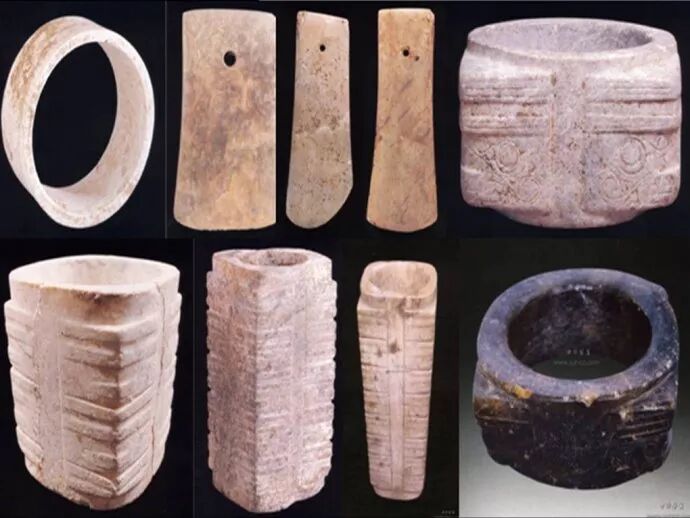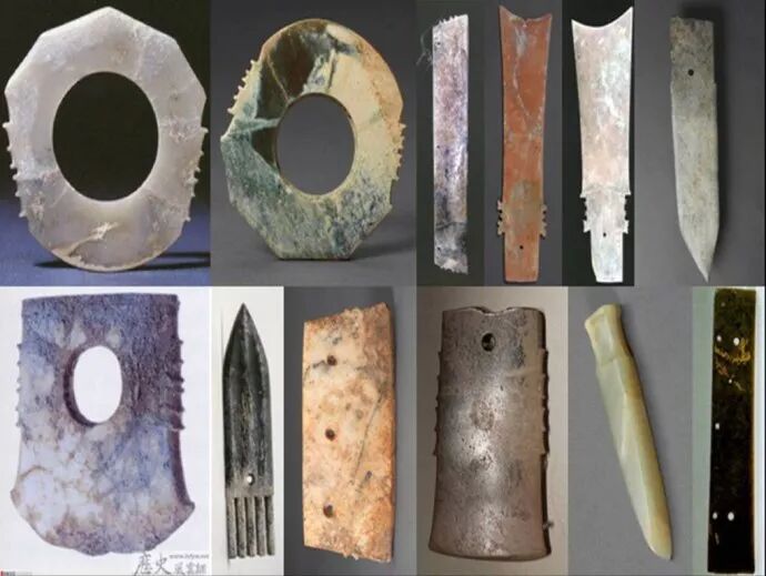 大禹治水的故事,其实是这个民族数百年来十几甚至几十代人治水事迹的总和。无论在山东半岛、陕西神木以及偃师二里头,我们都极少看到有玉琮的出土,这就是夏后氏玉器与有虞氏玉器的重大区别。有虞氏玉器最初来源于南方,随后又吸收了大汶口文化晚期以及早期龙山文化的因素。夏后氏玉器则起源于海隅,多兵器以及仪仗,这是夏后氏以强大武力统一中国的写照。周民族的祖先亦有可能出自良渚,后稷(弃)的经历告诉我们周的祖先将良渚玉器文化溯长江向西传播到了四川盆地,然后又北上越过秦岭到达渭水流域。传说尧部落起先受封于山东定陶,这与帝喾的统治中心不远。帝喾和帝颛顼均采取了东和少昊、南伐共工的战略,但是从帝尧开始,却发动了对东夷的战争,以及越过长江打击共工氏的战争。尧命后羿族射“十日”、杀“凿齿”等东夷诸族的传说,正是尧的部落在山东对东夷族大开杀戒的证明,因为东夷是崇拜太阳的民族,并且几乎所有东夷人都有“凿齿”的习惯。战争和洪水使尧的国力每况愈下,而南下讨伐共工氏的祝融一族竟然在江南自立为国,一去不回。为了躲避洪水尧不得不向西方和向北迁移。传说帝舜囚禁或者流放了最后的尧帝,这是因为尧的西迁使先一步到达山西的有虞氏感到了威协。于是尧部落只好逃往河北省北部的唐县,史称帝尧之“北教八狄”,于是尧的这一族最终沦落为北方的狄人。尧部落所去的地方正在夏民族东归的路线上,他们是否曾遭到夏人的迎头痛击,一切已无从得知。
