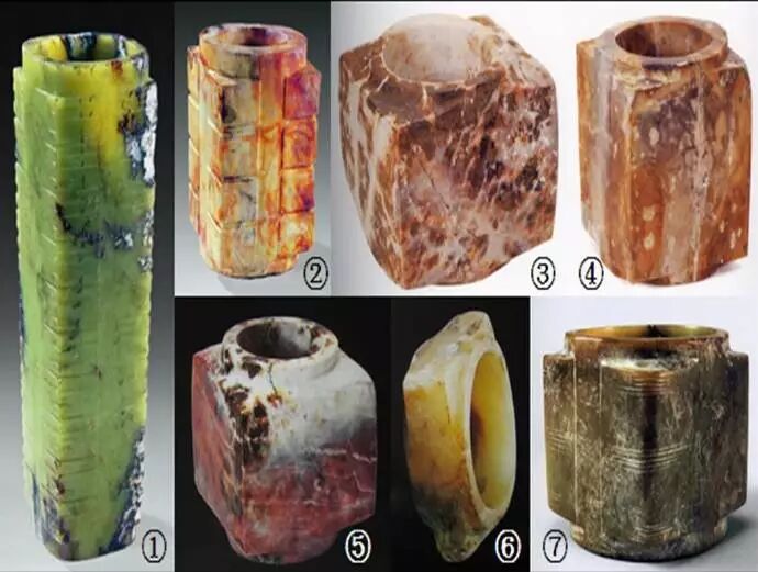 50、四川地区出土的玉琮。图①出土于成都金沙遗址,这只玉琮已被考古专家们确定为来自良渚的玉琮,它的年代竟然比这个遗址本身还要早1000多年。图②~⑥也是出土于金沙遗址的玉琮,但是这些玉琮却是用四川本地的玉料制作的。图⑦是出土于四川广汉三星堆遗址的玉琮,这只玉琮带着明显的西部风格。我们发现在良渚古国灭亡以后,玉琮文化在长江中下游地区、泛珠江流域以及南方沿海地区的传播,不久之后便迅速走向消亡,但只有位于中国西南部的四川盆地是一个例外,原因大概由于这本是一个富有的、藏在高山峻岭之中的不易为外部入侵的盆地。古蜀人亦自称是黄帝的子孙,帝颛顼一族最早起源于四川,周人的祖先后稷死后亦埋葬于成都平原,且更有大禹出生于汶山北川县的传说。