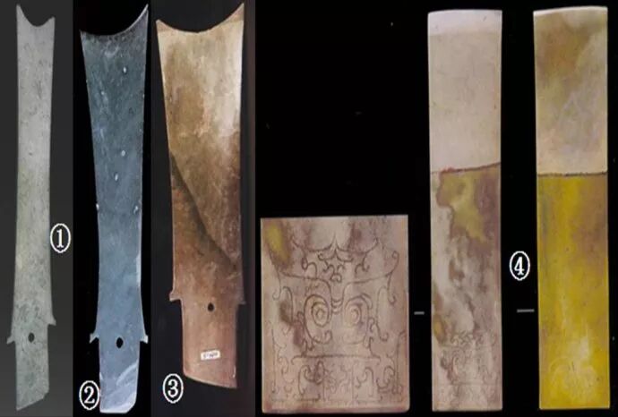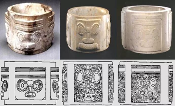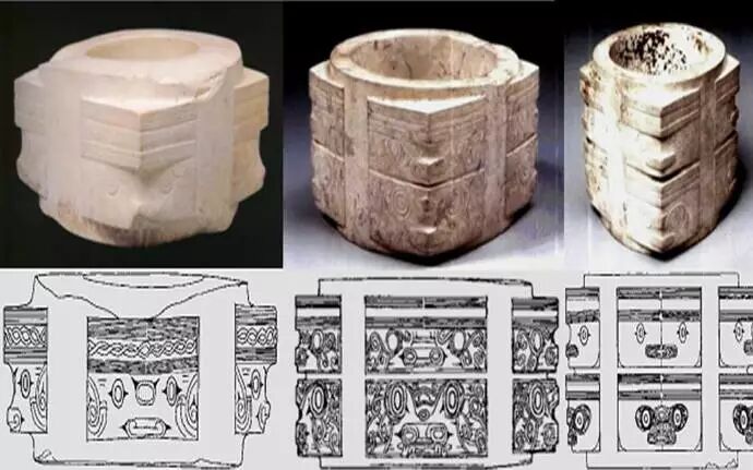 那么,在4200年前,是什么人将良渚玉琮带到了成都平原?玉琮文化在四川的传播,几乎是连续而不间断的,所以这是一个奇观:自金沙遗址出土的玉琮,从良渚“原装”的玉琮到夏代玉琮、商代玉琮以及周代的玉琮,品种齐全,应有尽有。图①的这只良渚玉琮,它的出现最少有二种可能性:第一,可能是周人的祖先在战乱之中迁徙至此,果如此,则周人的祖先亦来自良渚。第二,可能是帝尧或者帝舜下令“放欢兜于崇山”的移民政策所致,《山海经》明确记载“欢兜”一族出于崇伯鲧,并且炎融(犬戎)以及苗民的一部分亦出自于崇伯鲧。四川盆地古称蜀州,又称崇州,故崇即是蜀也。中国古代的“三苗”人,他们的族源十分复杂,有学者说“苗人”就是指南方种水稻的民族的总称,言之颇为有理。良渚人的扩张,其势力由浙北波及江苏全境以及安徽、湖南和湖北,那么水稻的种植技术,随之也向上述地方扩散,故所谓苗人,即南方之人也。在北方统治者看来,良渚人是苗,他们是黄帝族,颛顼之后,祝融氏;鲧也是苗,黄帝族,颛顼之后,有崇氏。及至帝舜之时,舜的祖先有虞氏本来无疑也出身于苗,帝尧的儿子丹朱在舜的打压之下逃往南方,竟然受到了一部分苗民的拥戴,于是堂堂的北方王族从此也一并沦落为苗,而北上的有虞氏一旦吃上了黄河的小米,从此就不再是苗了。据说最后一代的帝尧逃往河北省北部,从此末代的尧和他的追随者们,又变成为了北方的“狄”。