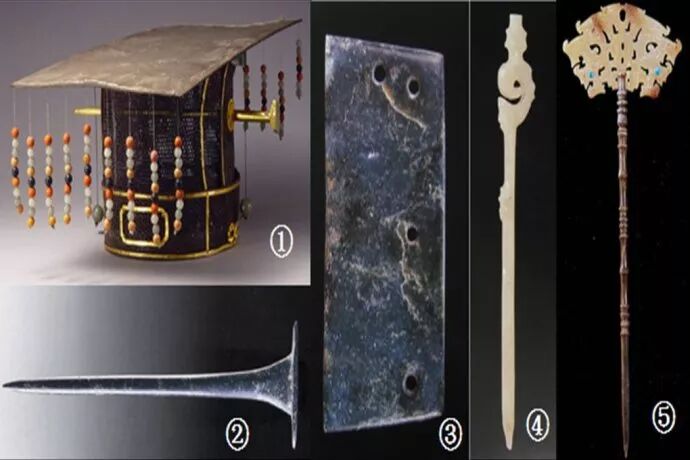 58、山东龙山文化玉笄与中原衣冠的渊源。图①是中国古代帝王专用的的冕冠,我们可以从中看到笄在其中所起的固定作用。图②是一支仰韶文化玉笄,长25.7㎝,出土于陕西省武功县游凤新石器时代遗址,现藏于西北大学文博学院博物馆。很显然它是用来固定一种原始的头冠状物的,这种笄最早流行于黄河中部地区,而在山东地区的土著,更习惯于使用獐牙来束发。图③④⑤是出土于山东省临朐县西朱封村龙山文化大墓中的遗物,这包括一只玉刀和两只玉簪(笄)。图⑤中的玉簪通高23㎝,柄长19.6㎝,通体饰有竹节旋纹,玉簪的簪首是一片极为精美的兽面纹透雕,它是黄河文明与东海文明的结合体。临朐县出土的玉笄是山东龙山文化玉器中的极品,即便是在商代和周代,这样的精美的玉笄仍然十分罕见。此物可以证明在龙山文化时代,山东地区的统治者本是来自中原地区的征复者们的后代,数百年后,他们又在这里创造了新的东夷文明。山东半岛特殊的地理位置,使她成为了大东亚文明的大溶炉和摇篮,各种北来的,南来的和西来的地方文明在这里汇合、成长以及升华。在龙山时代早期、中期、晚期和夏代早期,当有虞氏、夏后氏先后带着全新的东方文明重返中原时,有如一群中原文明的“海归”,一举奠定了数千年中原华夏文明的基础。