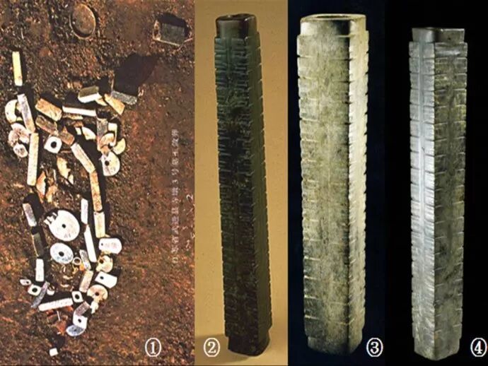 46、晚期的良渚,其政治中心转移至太湖北部的常州。这个时代的良渚玉琮,尺寸越做越大,节数越来越多,最多达时竟然达到二十余节。但大玉琮上的刻绘亦简化为神的眼睛层层相重,眼睛的神性越来越大。图①为江苏武进寺墩三号墓玉器出土地情况,玉琮环绕着墓主人,数量多达四十余只;图②为中国历史博物馆藏大玉琮,高49.2㎝,出土地点不明;图③安徽省肥东县张集乡刘岗村出土大玉琮,15节,高41㎝,这是目前超过40㎝的大玉琮中,唯一有明确出土记录的一只;图④是大英博物馆藏的一只大玉琮,高49.5㎝,出土地点不明。