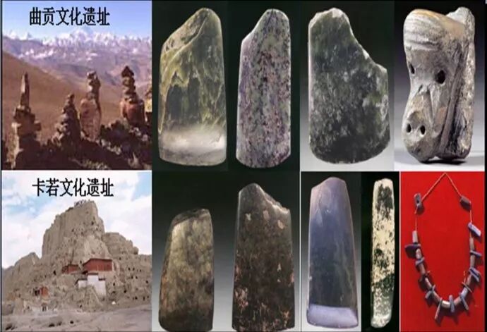 18、曲贡文化遗址,位于西藏自治区拉萨市北郊的娘热山沟曲贡村,距今年代约在3500~4000年之间。曲贡发现的这些玉器,证明了拉萨在很久以前就有人开发和定居,而在此时,西藏地区已经发现了青铜器。卡若文化遗址,在西藏昌都镇以西约十二公里处,距今年代约在4000~4500年之间。受史前地理环境的影响,同样有着丰富的玉石资源的青藏高原,玉器的制作,仍然以玉锛、玉凿为主,这些坚硬的石头,用作木工的工具,在昌都的卡若,仍然普遍使用着玉锛和玉凿,而河煌地区的羌人,曾迁居于此,他们构成了早期藏族先民的一部分,于是从这里我们可以看到,黄河上游文明的影子。如果有人说,他们拥有或者密藏着一万年前,或者五千年前,来自青藏高原的玉器,在那上面契刻着精美的图案和所谓中国最早的“拼音文字”,那是逗你玩以及骗你钱,不过它们常常会使一些不学无术者欣喜若狂,从而花重金“收藏”,以为凭着它们,不费吹灰之力,就可以轻易改写中国的历史。