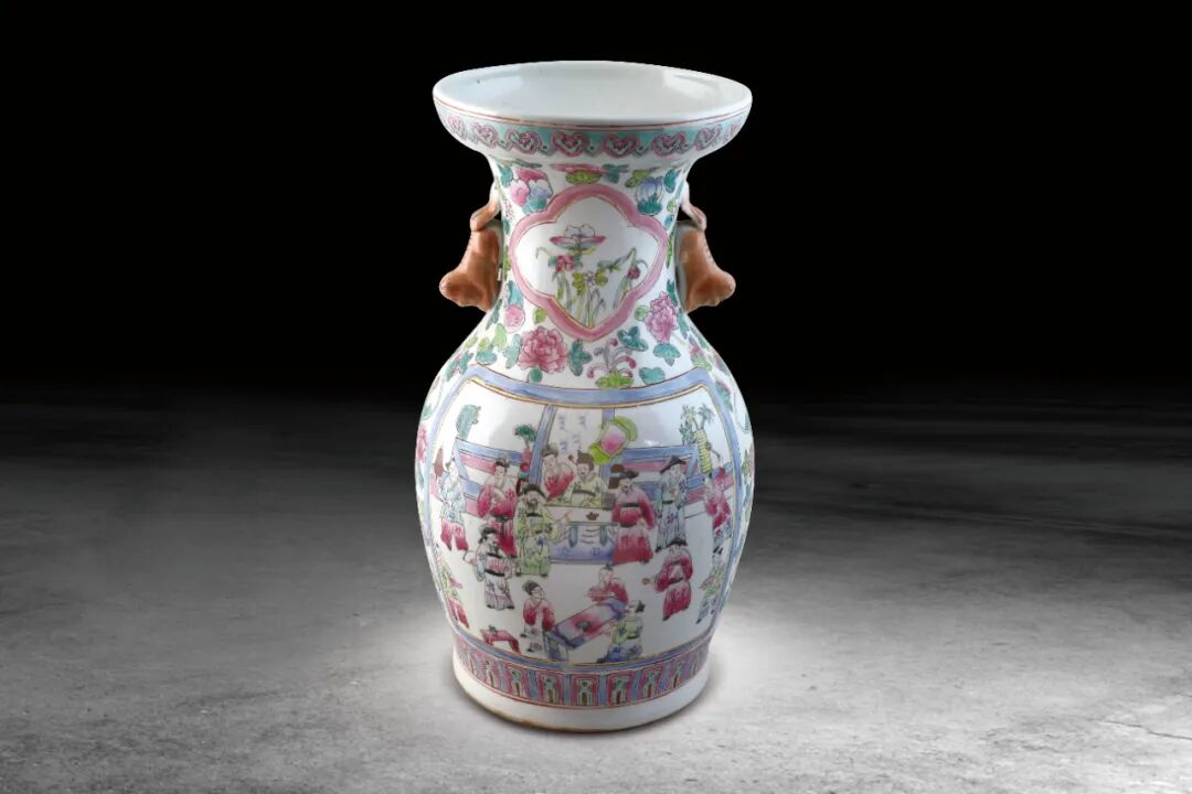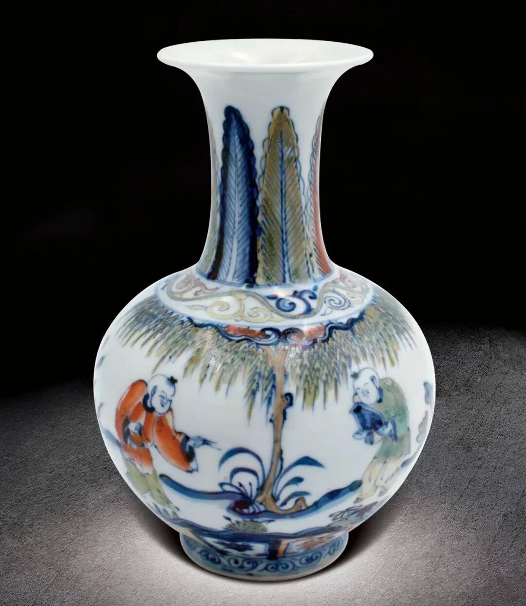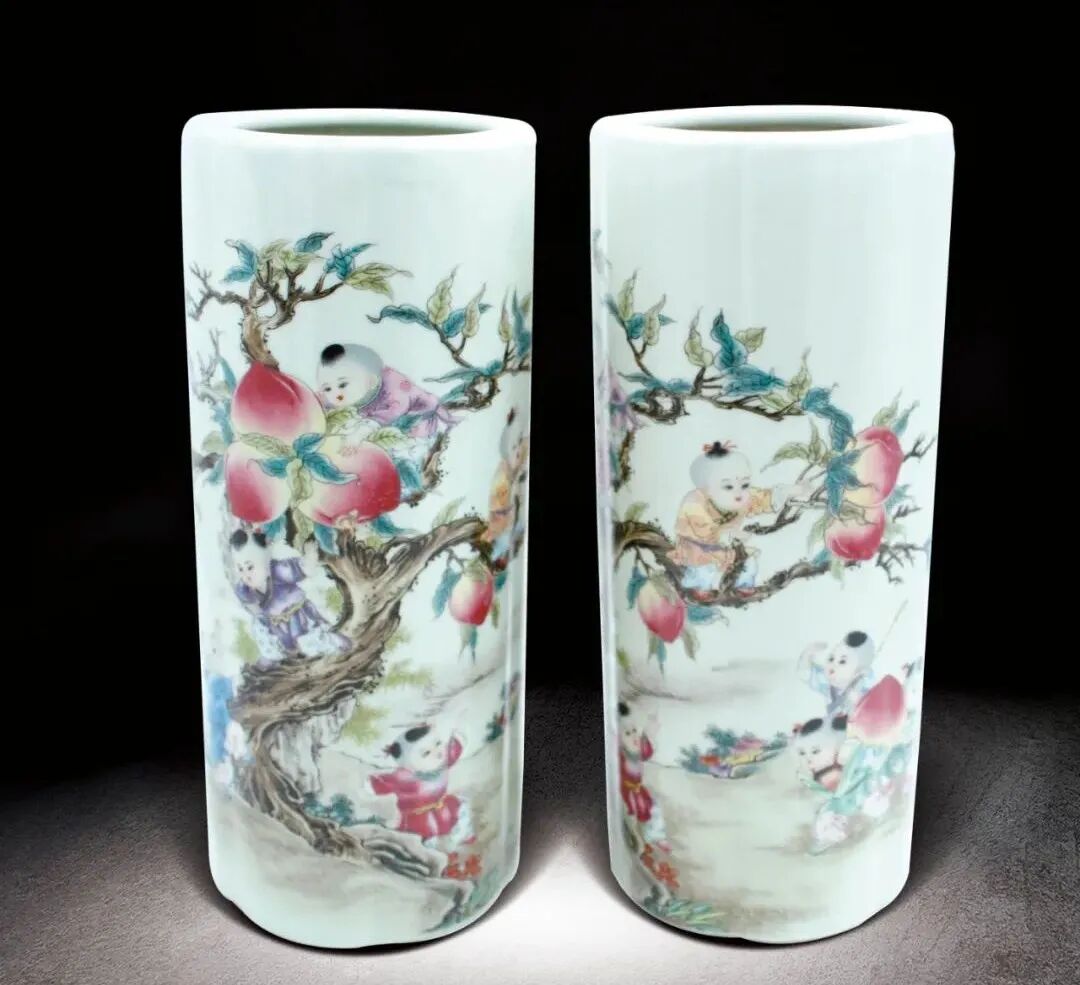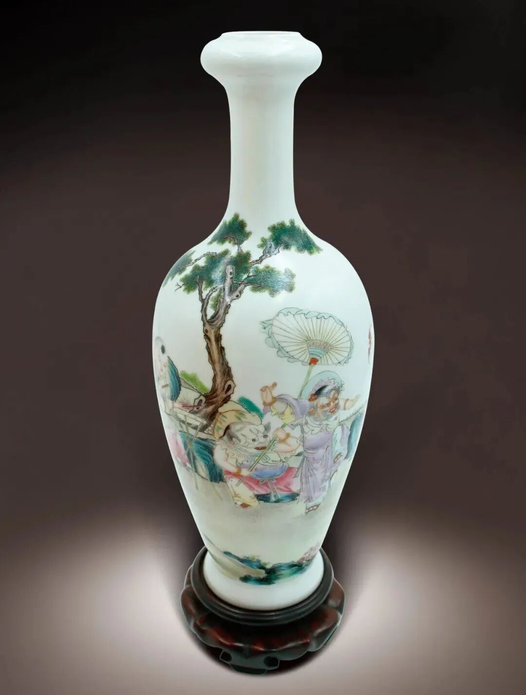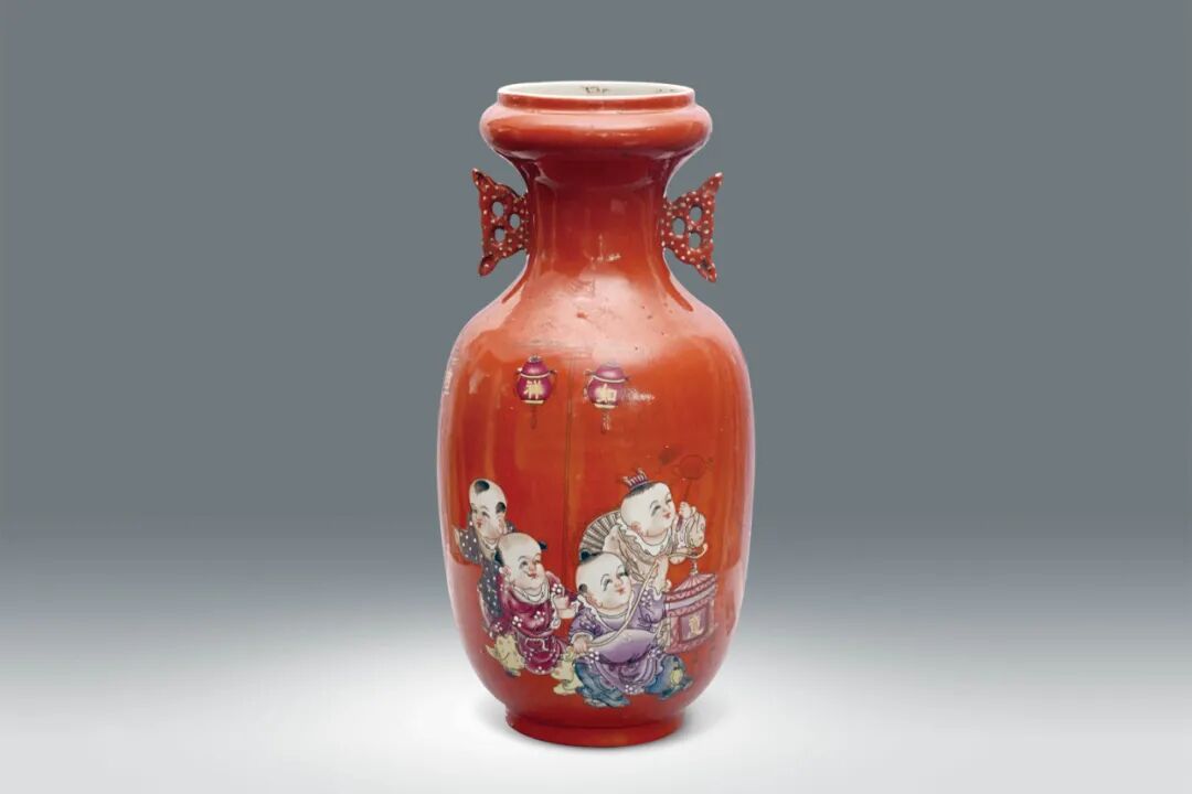 1 民國 紅釉粉彩嬰戲圖雙耳瓶