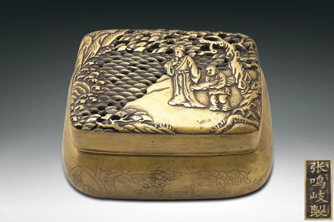 240 清 張鳴岐製銅雕人物紋暖手爐