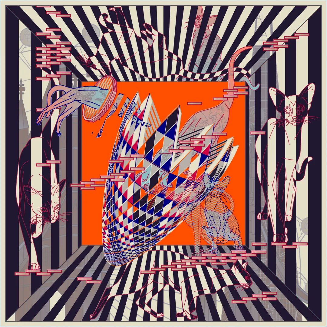 毕业于伦敦艺术大学的跨界艺术家曹羽不仅是艺术家,且还担任设计师的角色。其作品的视觉语言来源于对多种媒介的探索:丝网印刷、微喷、拼贴、mono print、陶瓷、涂鸦等。关注时下社会以及未来话题的思考与表达。时间和空间是构成画面的重要逻辑。受到波普艺术、欧普艺术以及符号学的深刻影响,有着强烈的个人风格和丰富的画面语言。擅长运用多重象征符号和风格化图案来表达丰富的信息。热衷于探索画面与不同媒介、载体结合的可能性。此幅作品来自于今年的新系列。