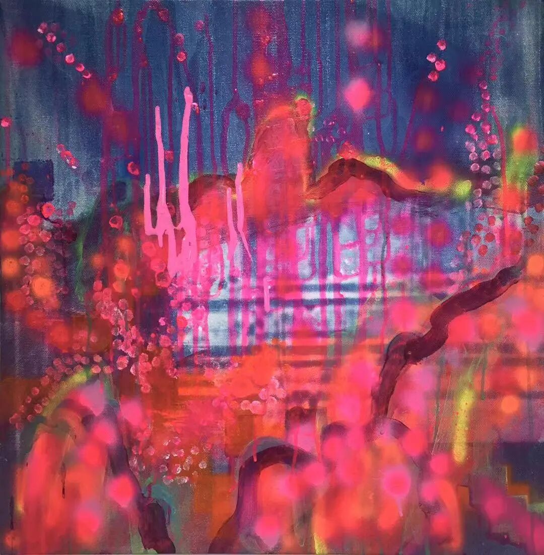 Charlie此系列的作品受到中国山水画的启发,如千里江山图等,并在绘画中融入了他眼中中国的城市景观印象,用抽象的手法,将他受到的这些文化冲击表达出来。而当代由于互联网的出现,全球化的文化差距不断缩小,而更加显现出,在这种似乎Globalization影响下,地域性的特色被冲刷的时代中,这样的独特的风景,和历史文化,变显得格外宝贵。此两幅作品,“多路器”及“隐藏信息”正是在这样的背景和灵感下创作的。在伦敦中央圣马丁艺术与设计院校学习过摄影和Fine art的Charlie,用自己跨专业的背景,摄影的蓝晒法,加多种颜料的绘画方式创作的独特风格。