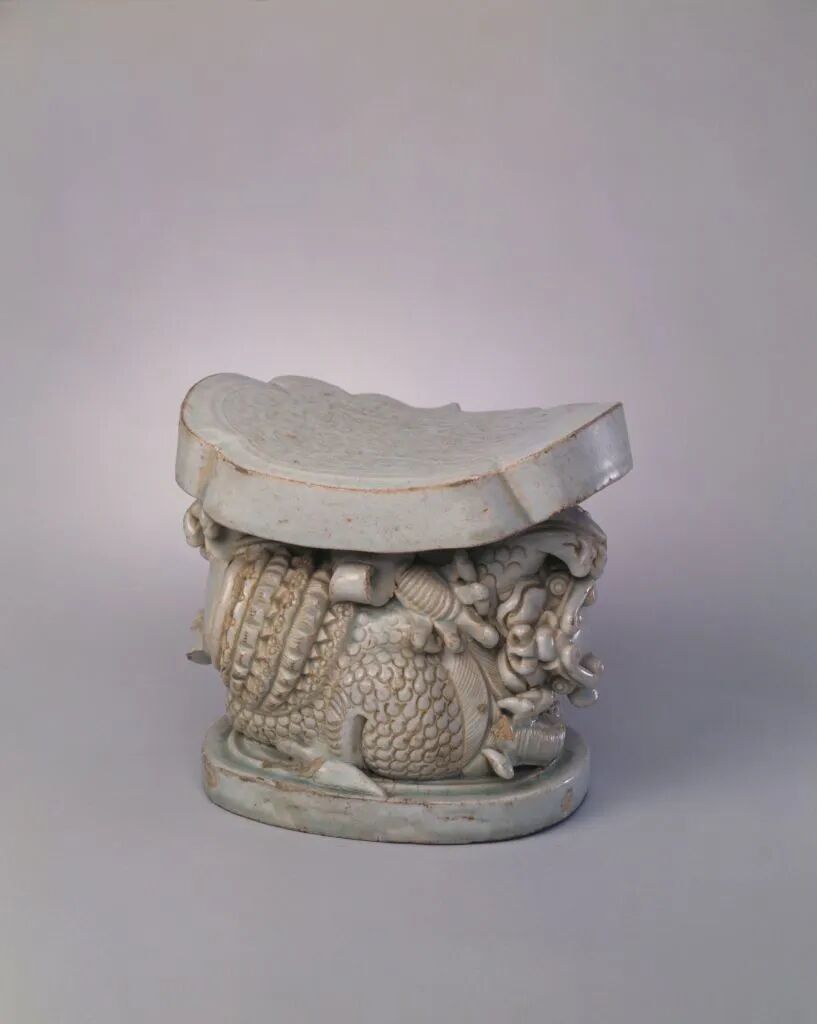 瓷枕是我国古代的夏令寝具,它清凉沁肤,爽身怡神,颇受人们的喜爱。唐宋时期一度广泛流行,宋代各窑曾大量烧造。这件宋代青白釉双狮枕,不仅造型生动,釉色莹润,有玉的质感,且兼具实用与欣赏双重价值,实为瓷中精品。