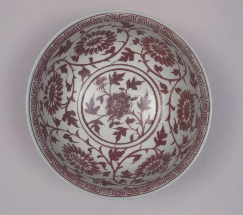 此碗的造型和纹饰构图都具有鲜明的时代风格,为洪武釉里红瓷器的代表作品。特别是其釉里红纹饰的发色,在传世或出土的洪武釉里红瓷器中,称得上较为纯正。
