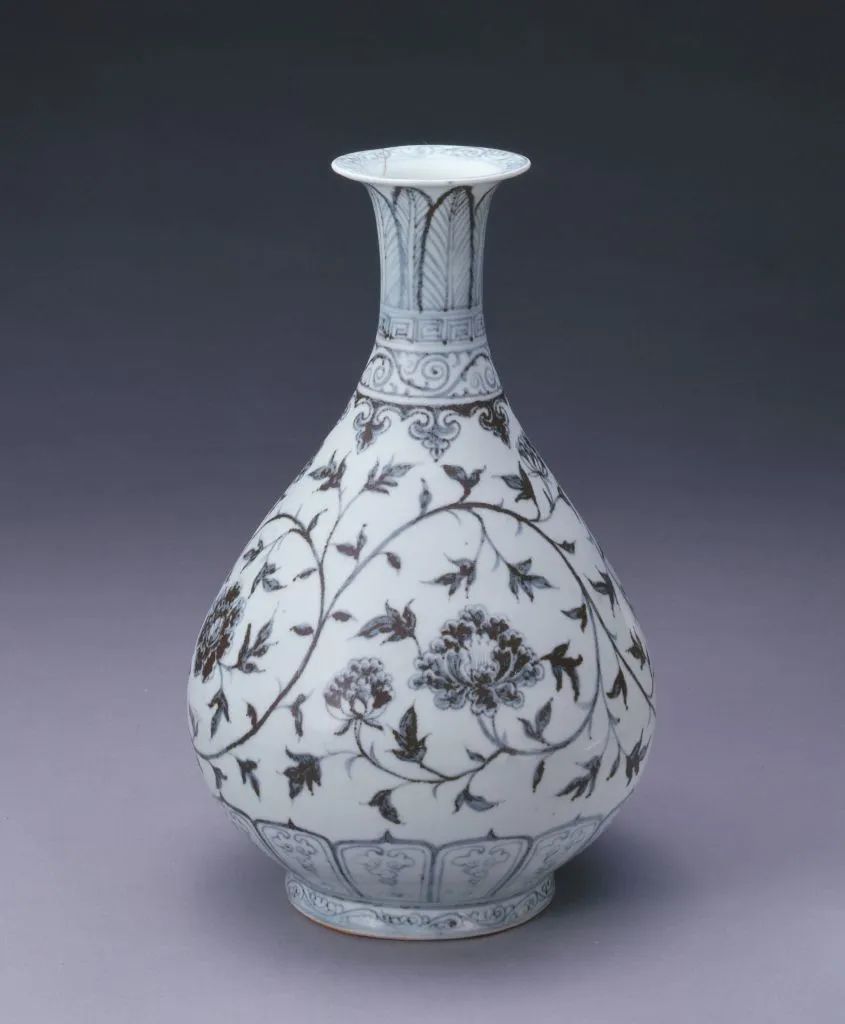 玉壶春瓶是明代流行的瓶式之一。这件洪武玉壶春瓶纹饰层次分明,布局疏朗,青花色泽沉静,青料聚集处有凝滞的黑斑。其造型与后世明代永乐、宣德时期的同类器相比,瓶口外撇的程度较大,近乎于折沿,颈部略显粗长,腹部重心偏低,因此显得敦厚稳重。