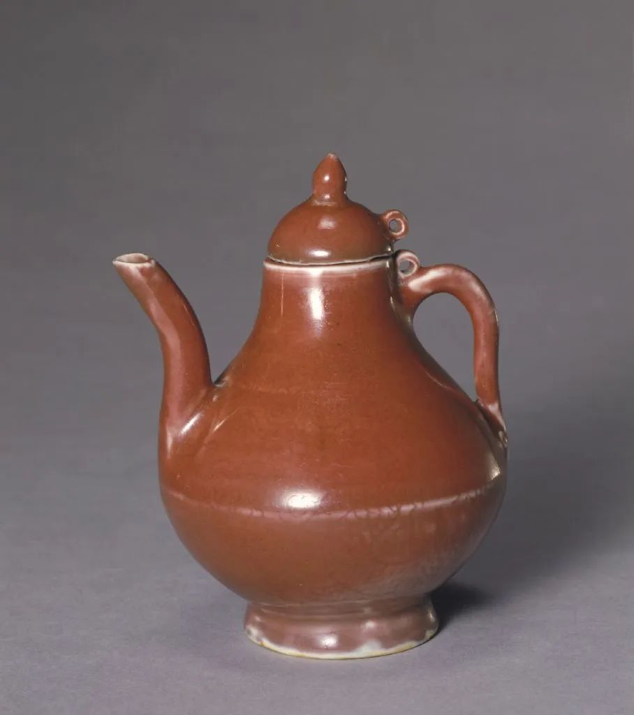 此壶釉面匀净,釉色鲜艳,是元代红釉器中的珍品。壶身的龙纹细颈长嘴,形态生动,具有鲜明的时代特征。
