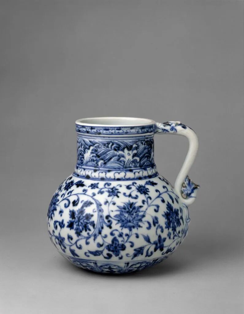 此花浇青花色泽浓艳,有黑色结晶斑。其造型风格系仿西亚黄铜壶器物。
