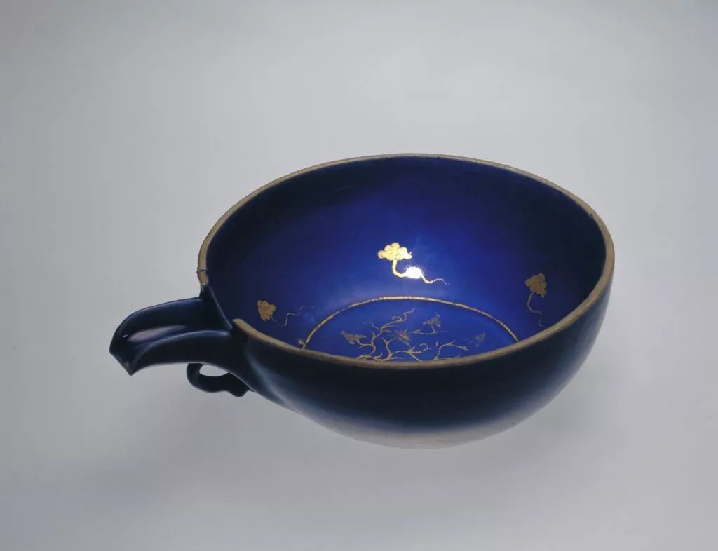 蓝釉描金折枝花、朵云纹匜,元,高4.5厘米,通流长17厘米,底径8.5厘米。