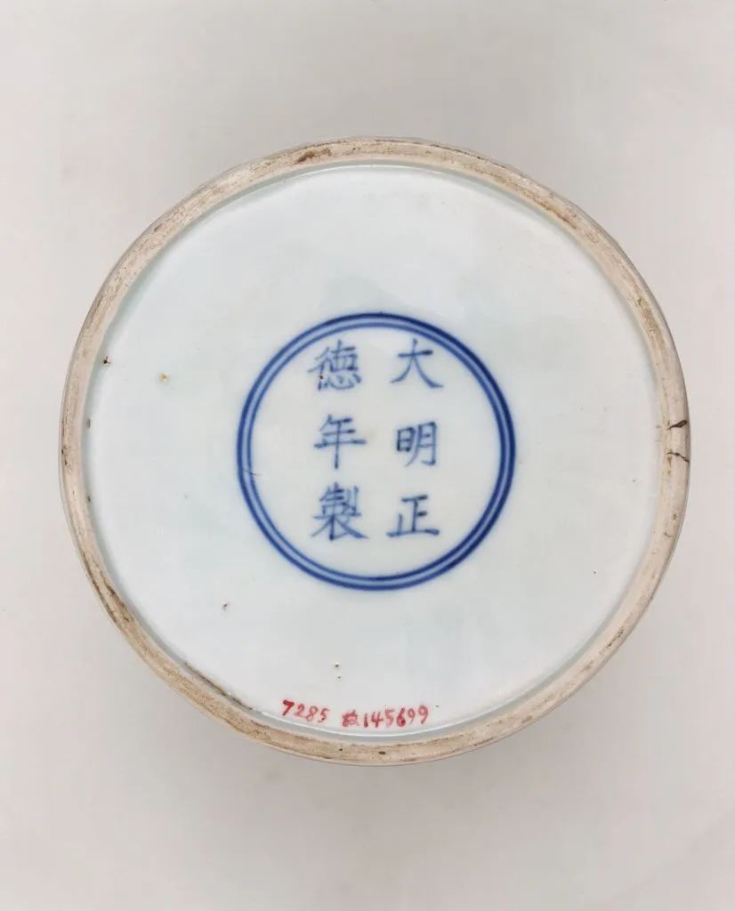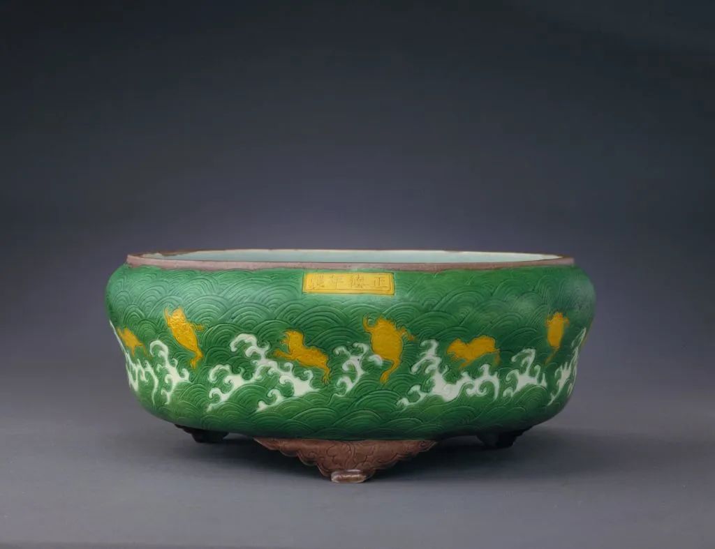 洗口内敛,平底,下承三如意头式足,口沿黄彩暗刻楷书“正德年制”四字款,内施青白釉,外壁刻划16个海中嬉游的蟾蜍,纹饰构图简练。以黄彩绘蟾蜍,绿彩绘海水,白彩绘浪花,紫彩涂口、足,色彩和谐分明,清爽悦目。传世的正德素三彩已屈指可数,这件洗可谓是稀世珍品。