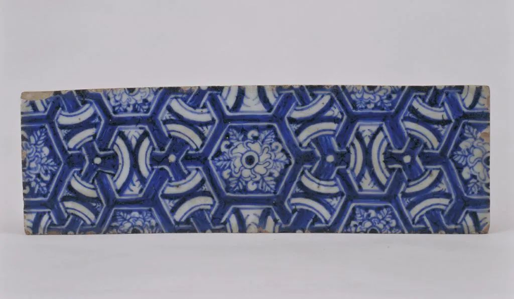 青花锁锦纹瓷板,明宣德,高2.5厘米,长28厘米,宽9厘米。