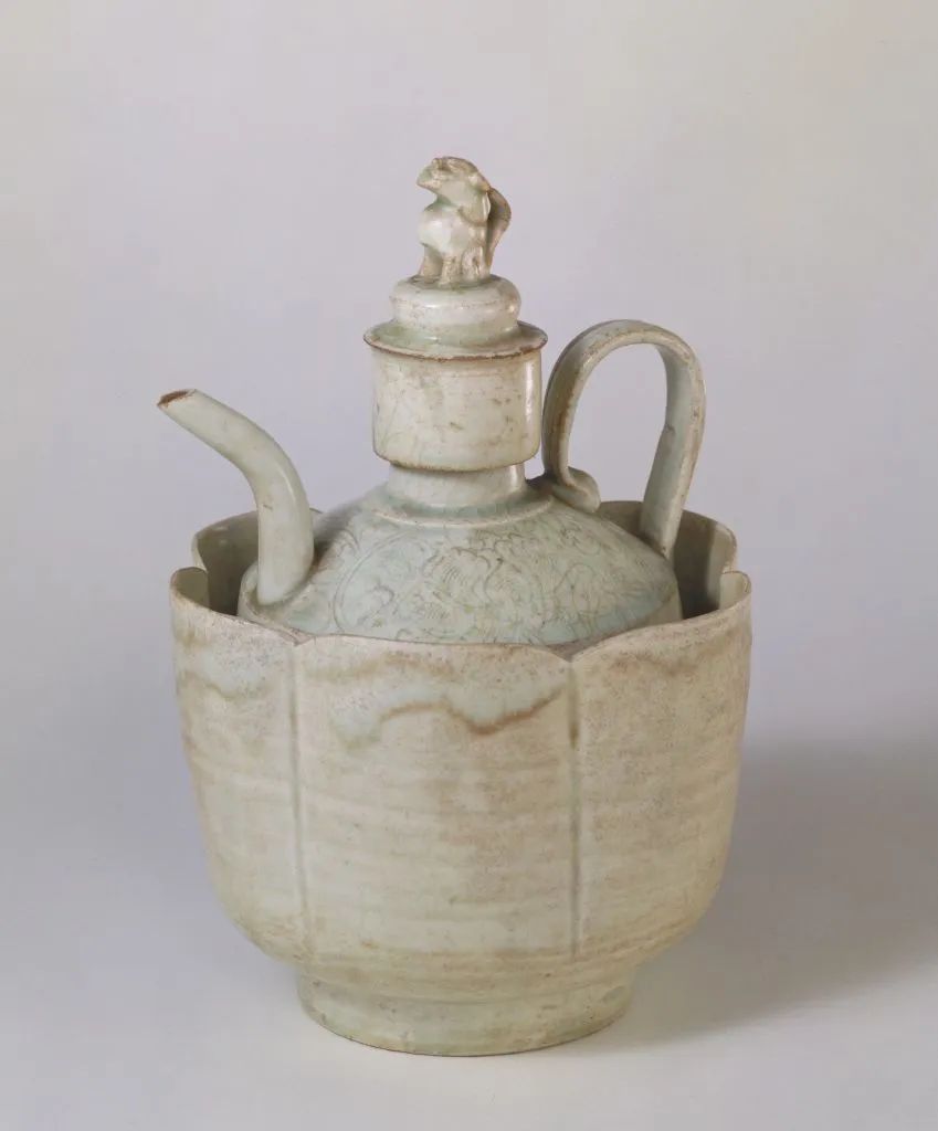 注壶直口,有盖,盖顶置狮形纽,折肩,弯流,曲柄,圈足。肩部划花缠枝牡丹。注碗葵瓣式口,碗体呈六瓣花形,圈足。注壶与碗通体施青白釉。