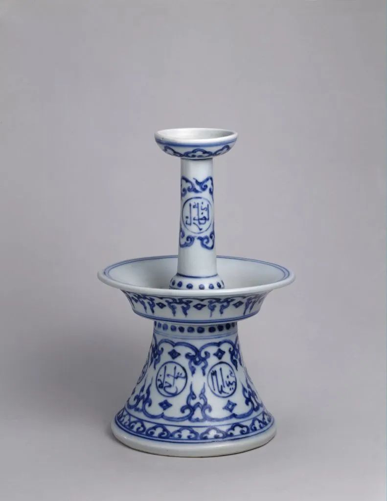 青花阿拉伯文烛台,明正德,高24.6厘米,口径6.7厘米,足径13厘米。