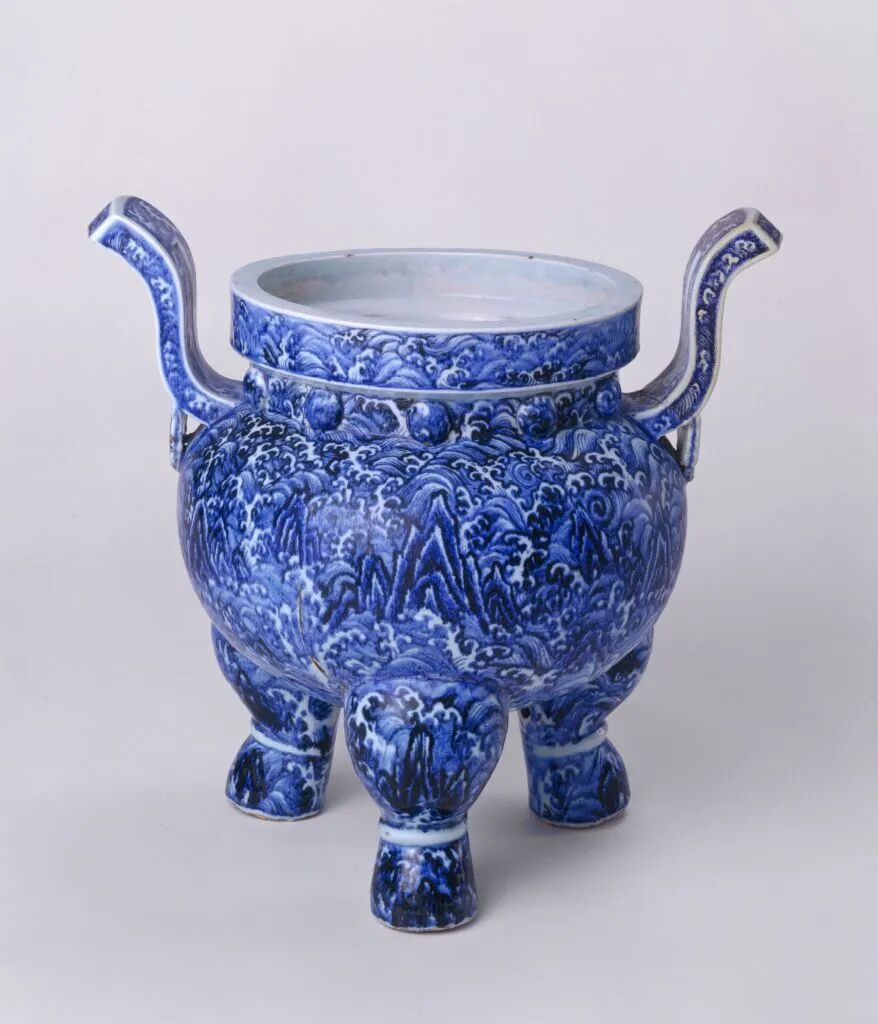 青花海水纹香炉,明永乐,高55.5厘米,口径37.3厘米,足距38厘米。