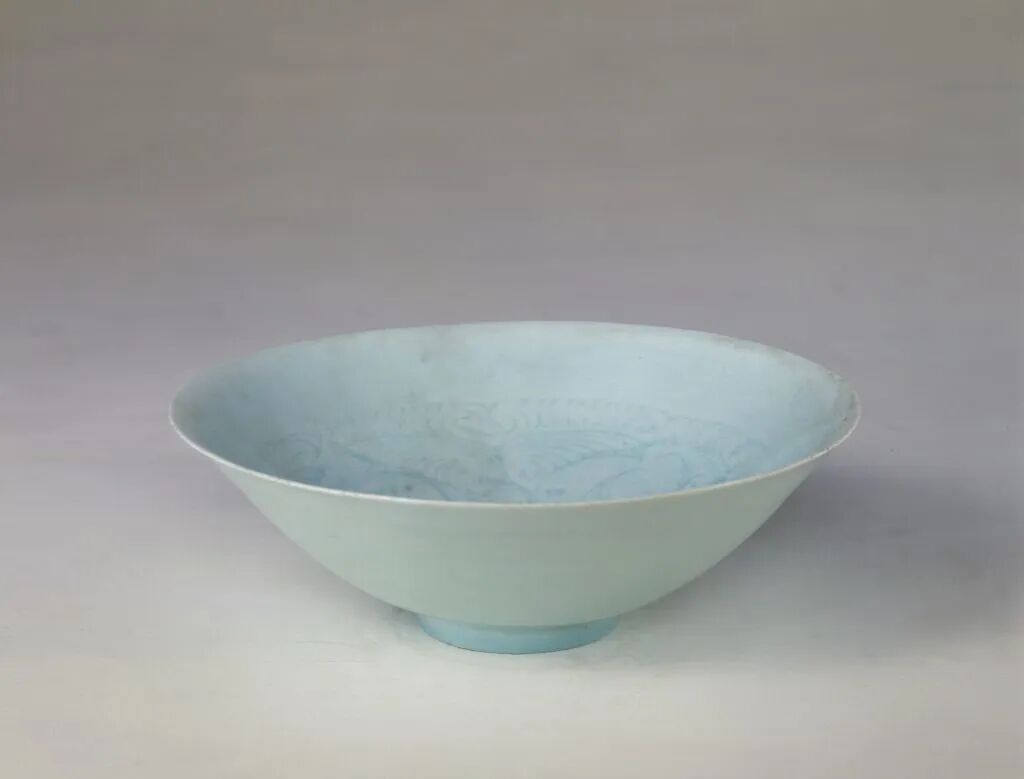 宋景德镇窑烧造的青白釉瓷以生产民间日用瓷为主,饮食具、酒具最多,盒类次之。青白釉青中有白,白中闪青,以介于青白二色之间而名。青白釉瓷胎体轻薄,所印、刻的花纹迎光透视,内外可见。景德镇烧造青白釉瓷的窑厂很多,以湖田窑规模最大,其产品种类丰富,质量精良,最具代表性。此碗即宋代景德镇湖田窑的一件代表作。